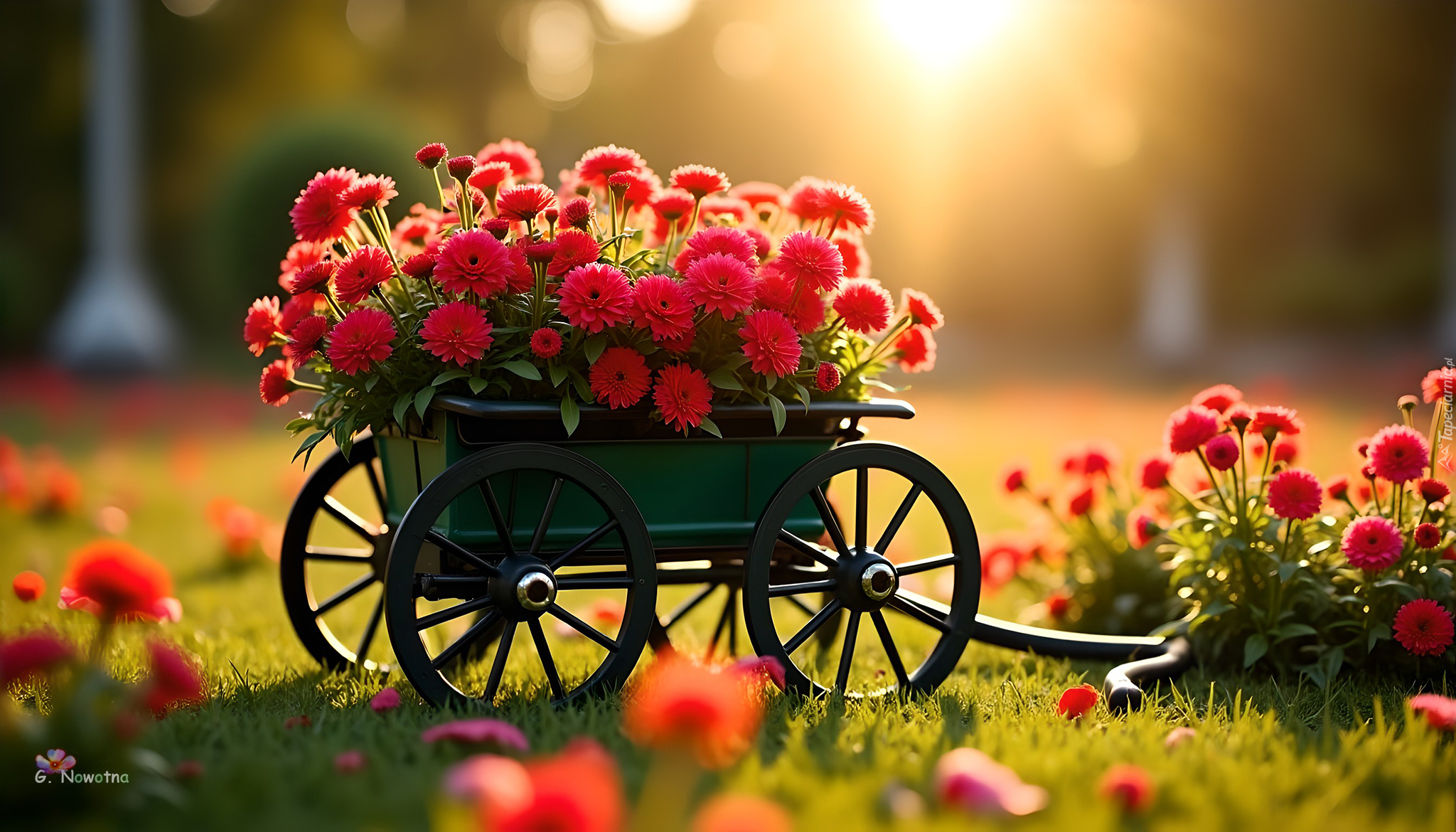 Edytor tapety: Wózek z czerwonymi kwiatami w słonecznym blasku