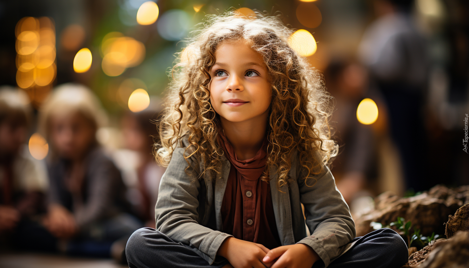 Edytor tapety: Spojrzenie siedzącej dziewczynki z długimi kręconymi włosami