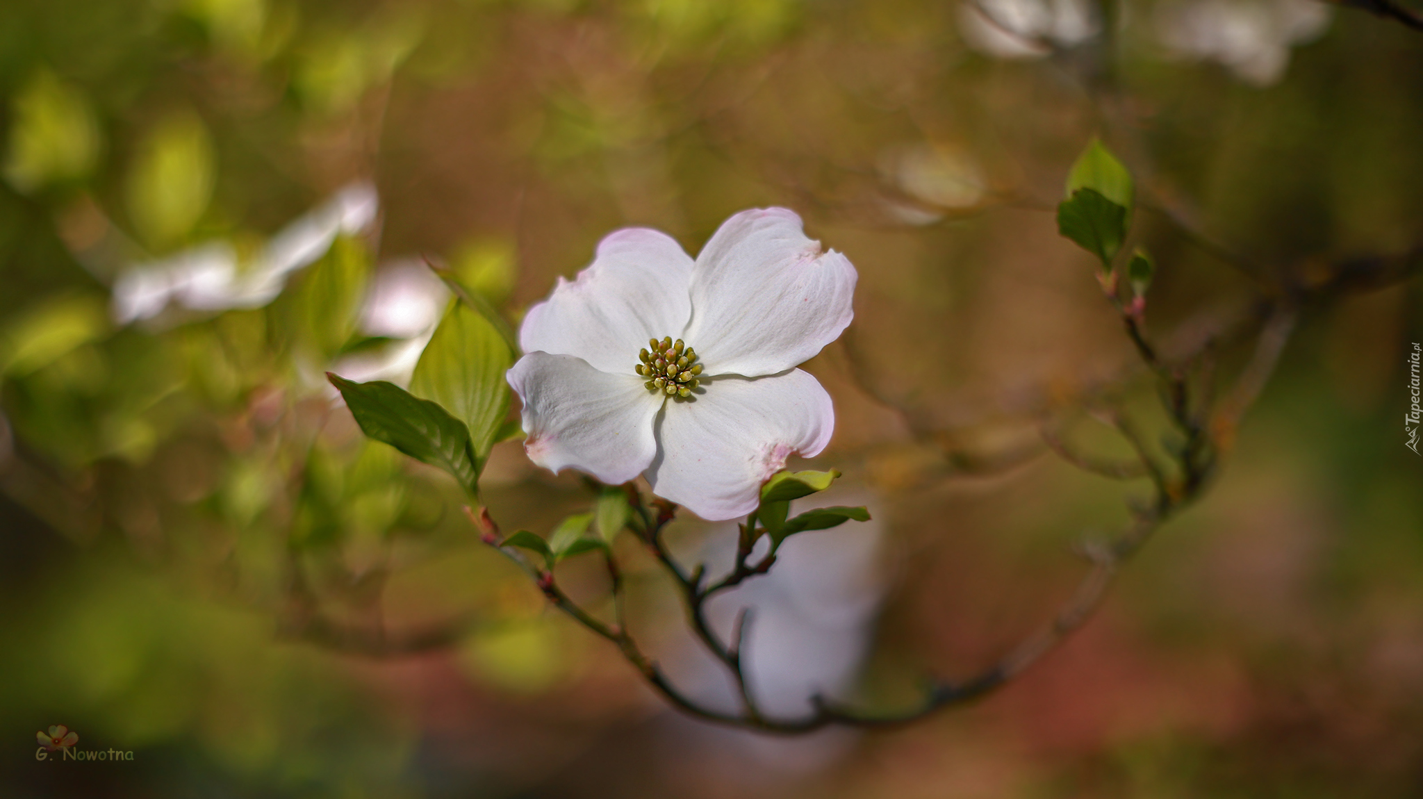 Edytor tapety: Rozkwitnięty biały dereń kwiecisty na gałązce