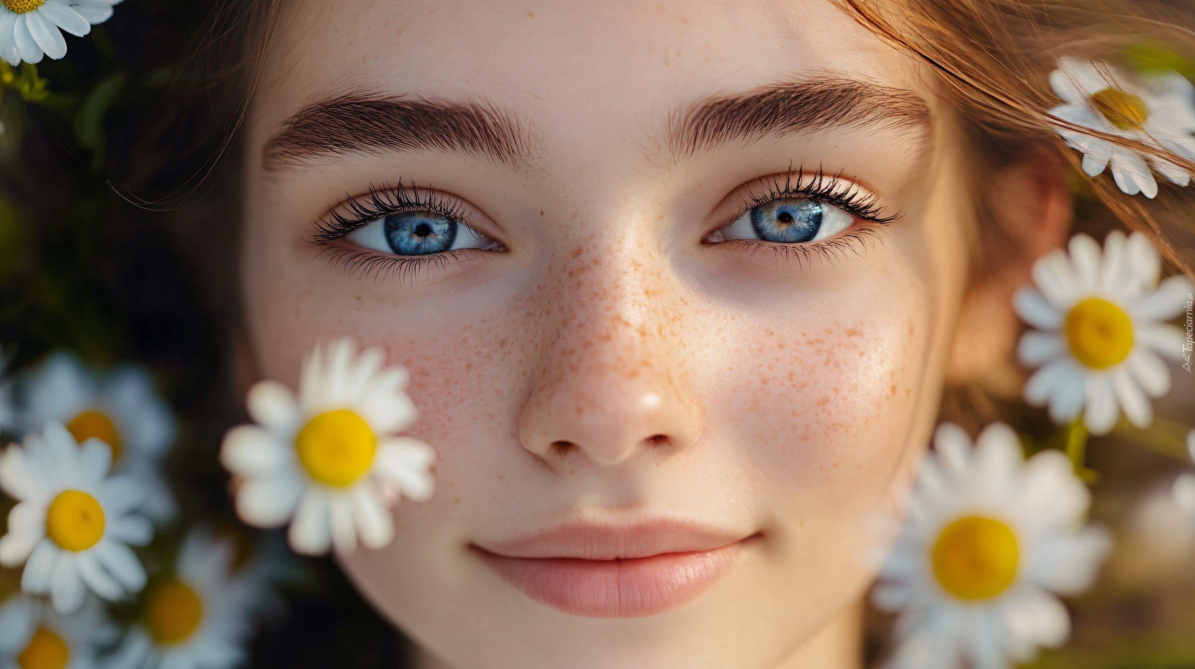 Edytor tapety: Uśmiech na twarzy piegowatej niebieskookiej dziewczyny
