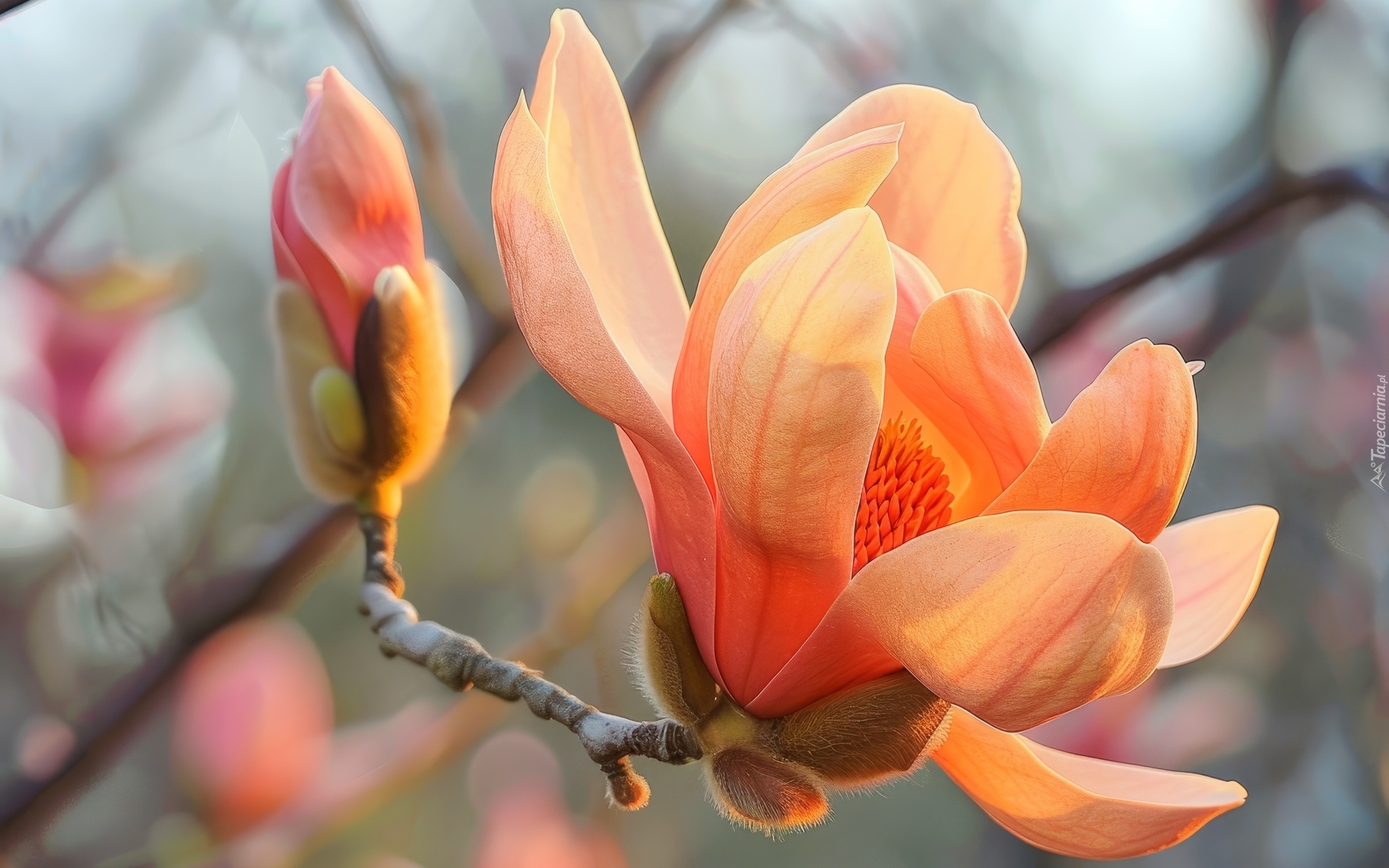 Edytor tapety: Pąk i rozkwitający kwiat pomarańczowej magnolii na gałązce
