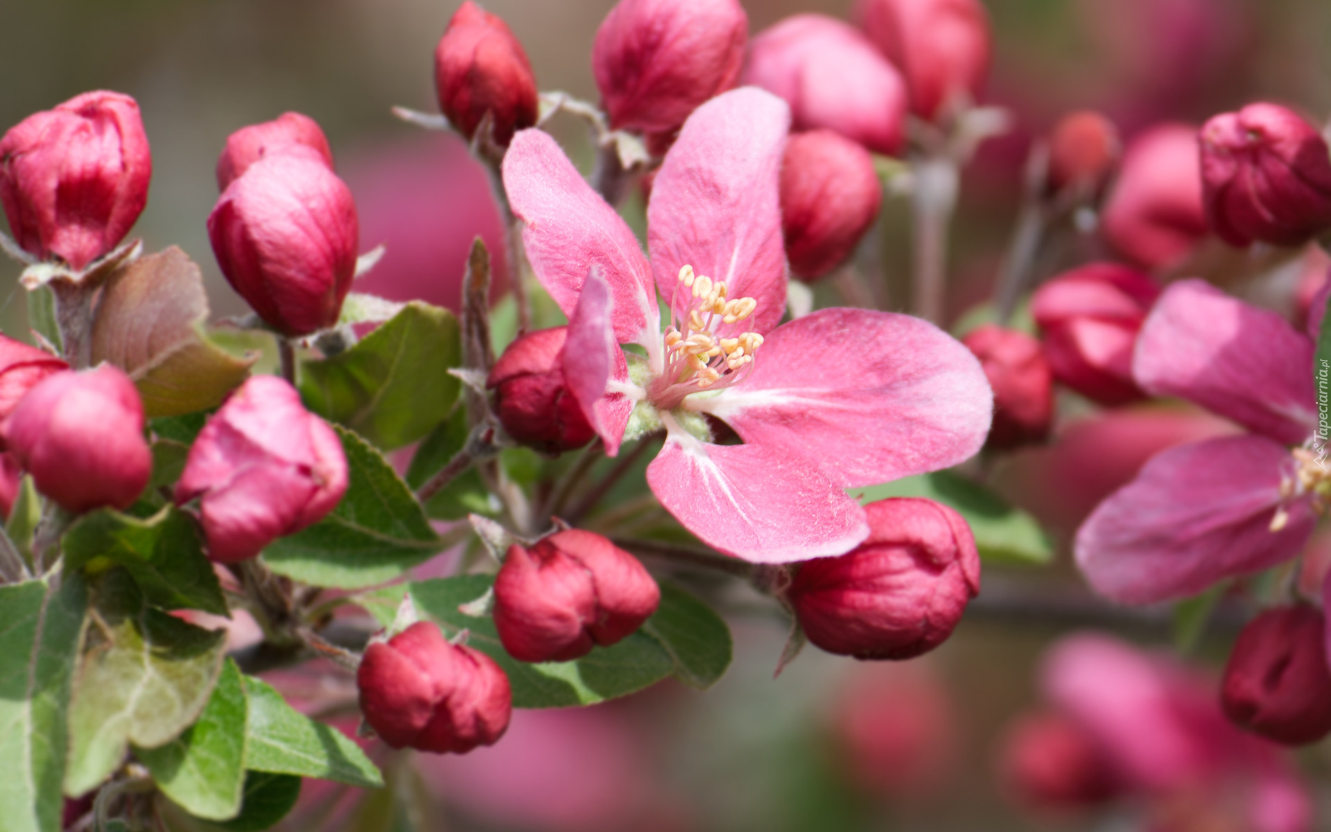 Edytor tapety: Różowe pąki i kwiat na gałązce drzewa owocowego