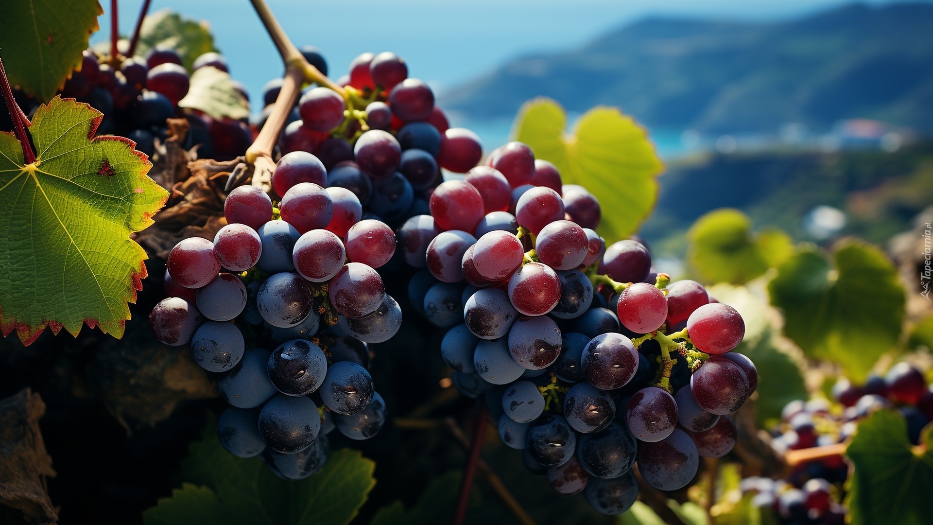 Edytor tapety: Kiście ciemnych winogron w słonecznym blasku