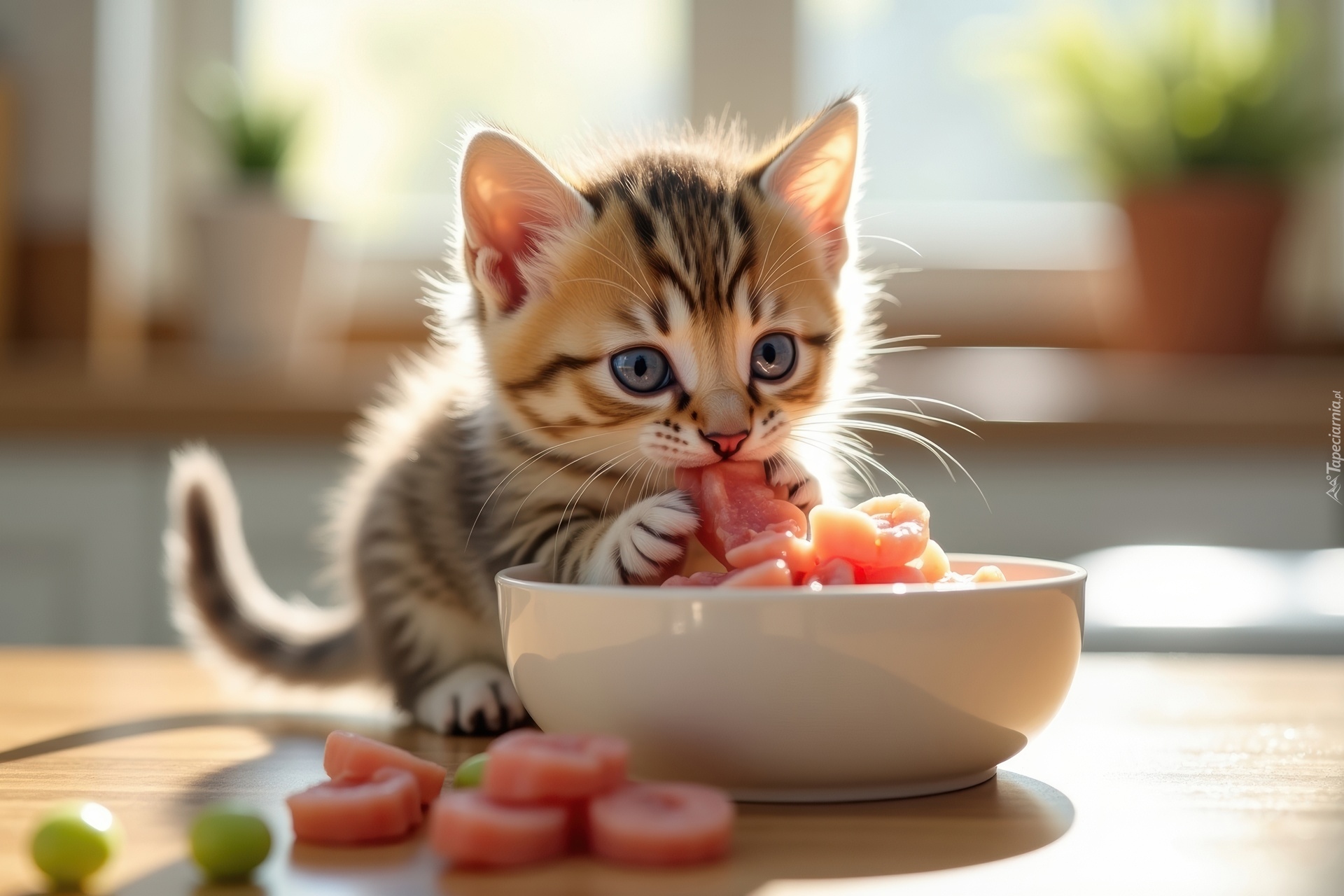 Edytor tapety: Mały kotek przy misce z karmą w grafice