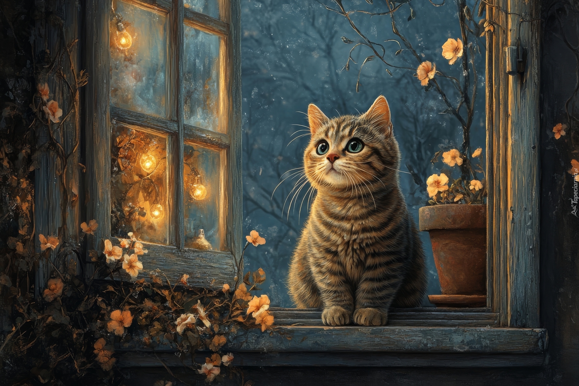 Edytor tapety: Kot siedzący w otwartym oknie obok kwiatów