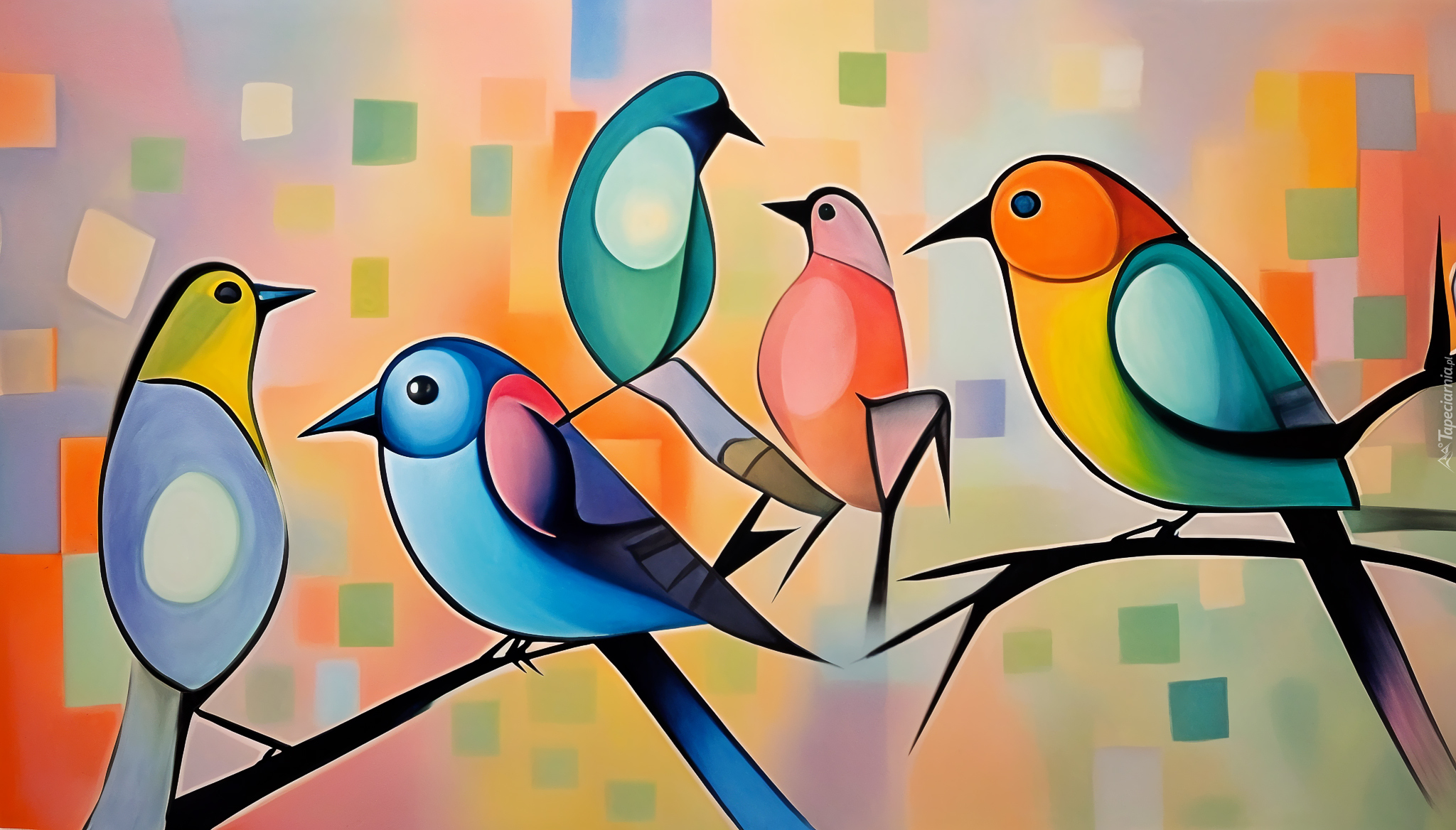 Edytor tapety: Grafika z kolorowymi ptakami na gałązkach