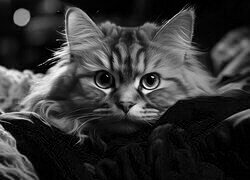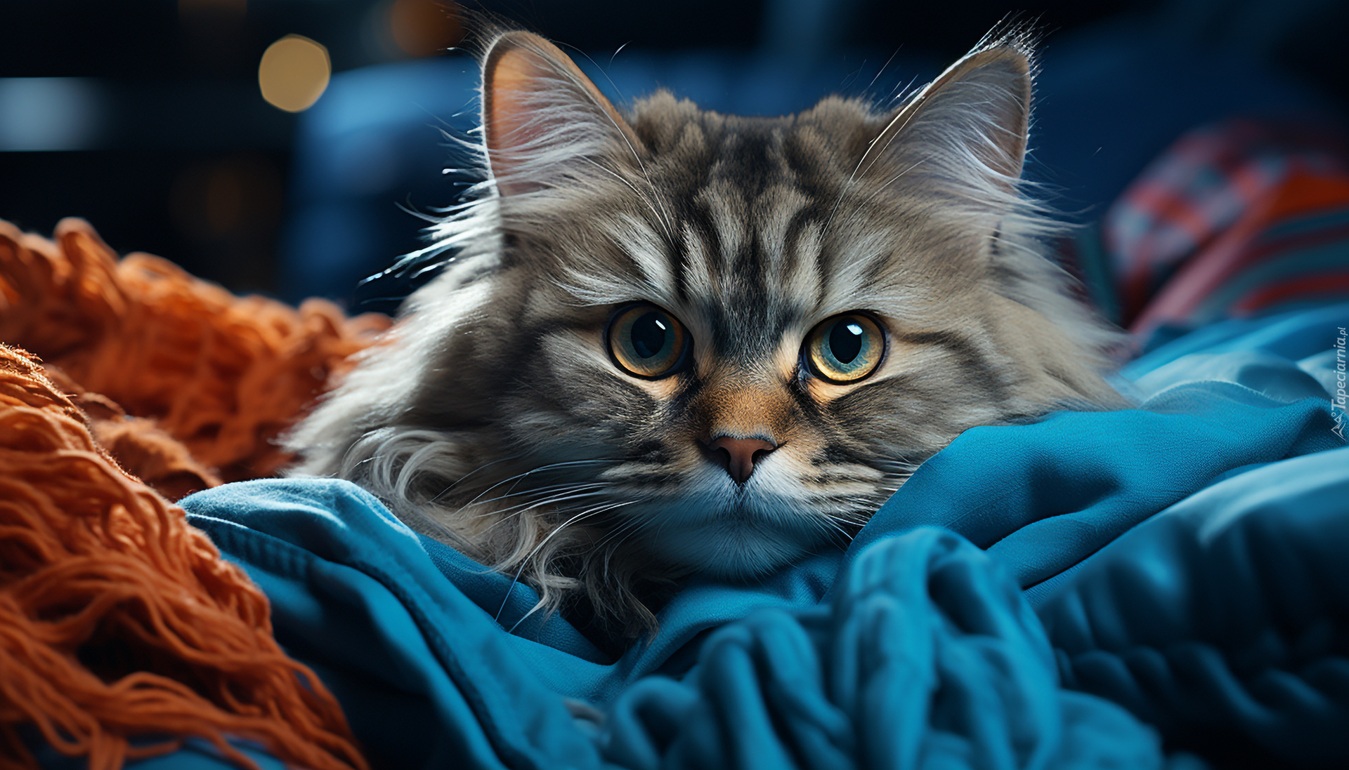 Edytor tapety: Szary puszysty kot leżący na niebieskim kocu