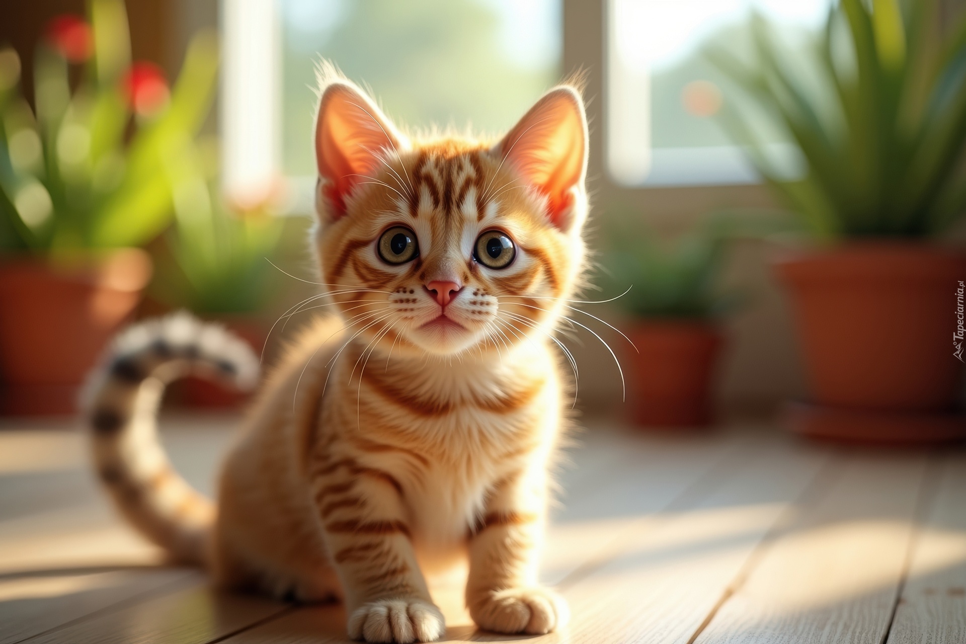 Edytor tapety: Mały rudy kotek siedzący na drewnianej podłodze