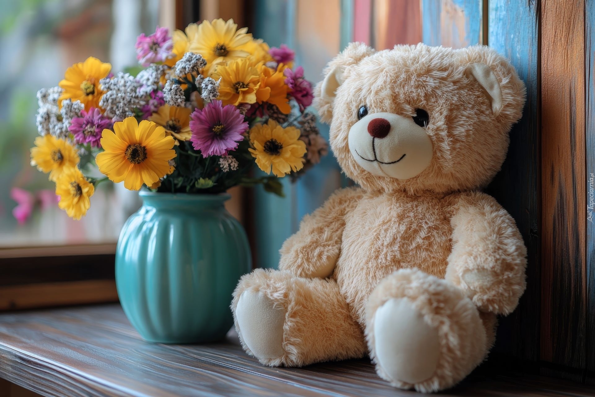 Edytor tapety: Pluszowy miś obok bukietu kwiatów w wazonie