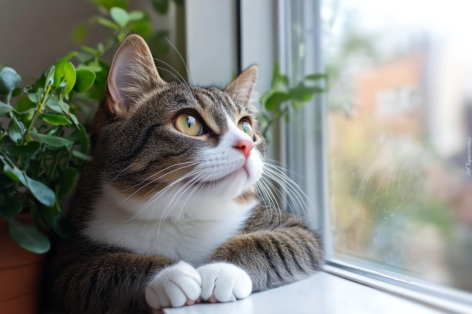 Edytor tapety: Biało-szary kot oparty łapkami o parapet okienny