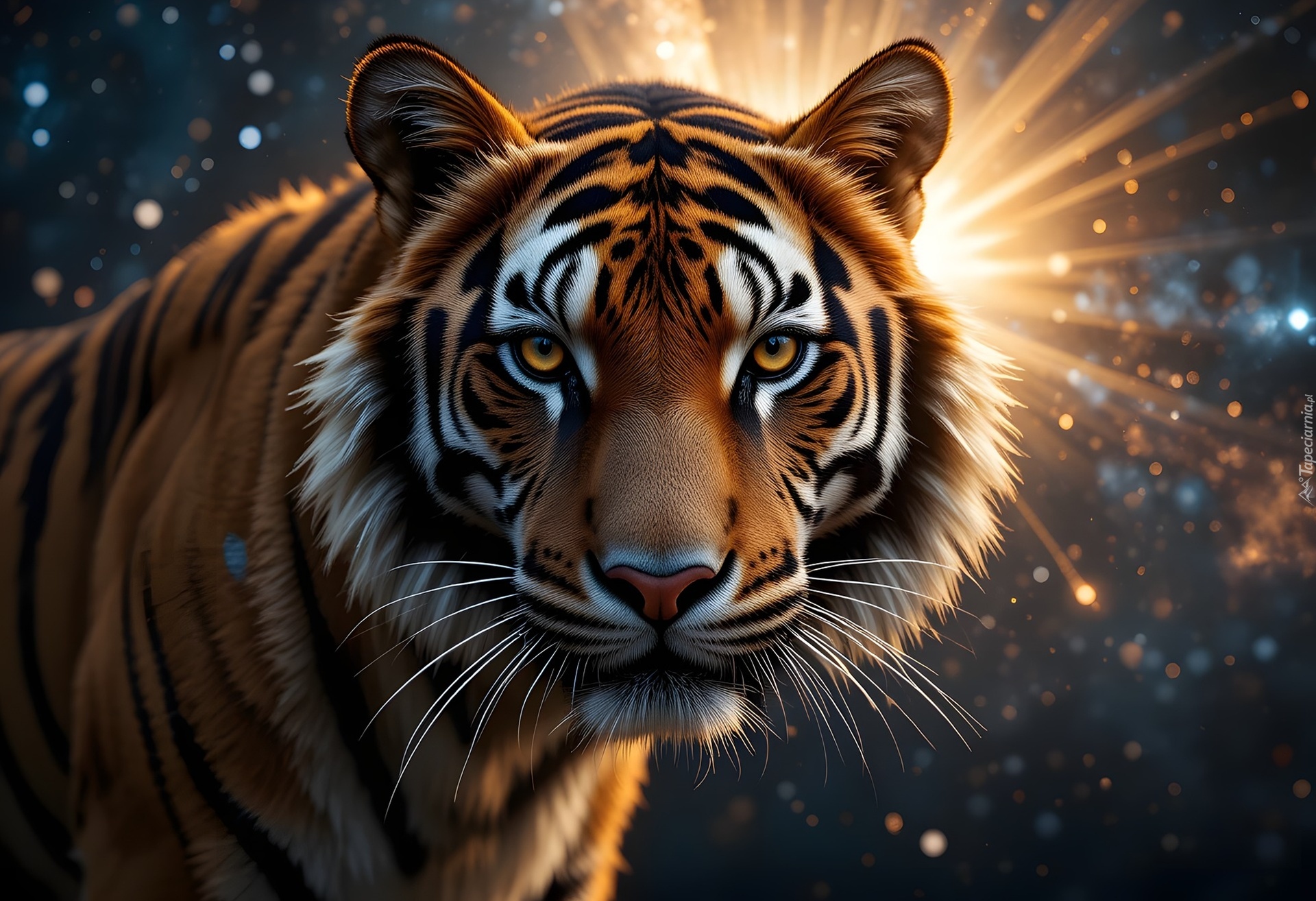 Edytor tapety: Tygrys na tle promieni słonecznych w grafice