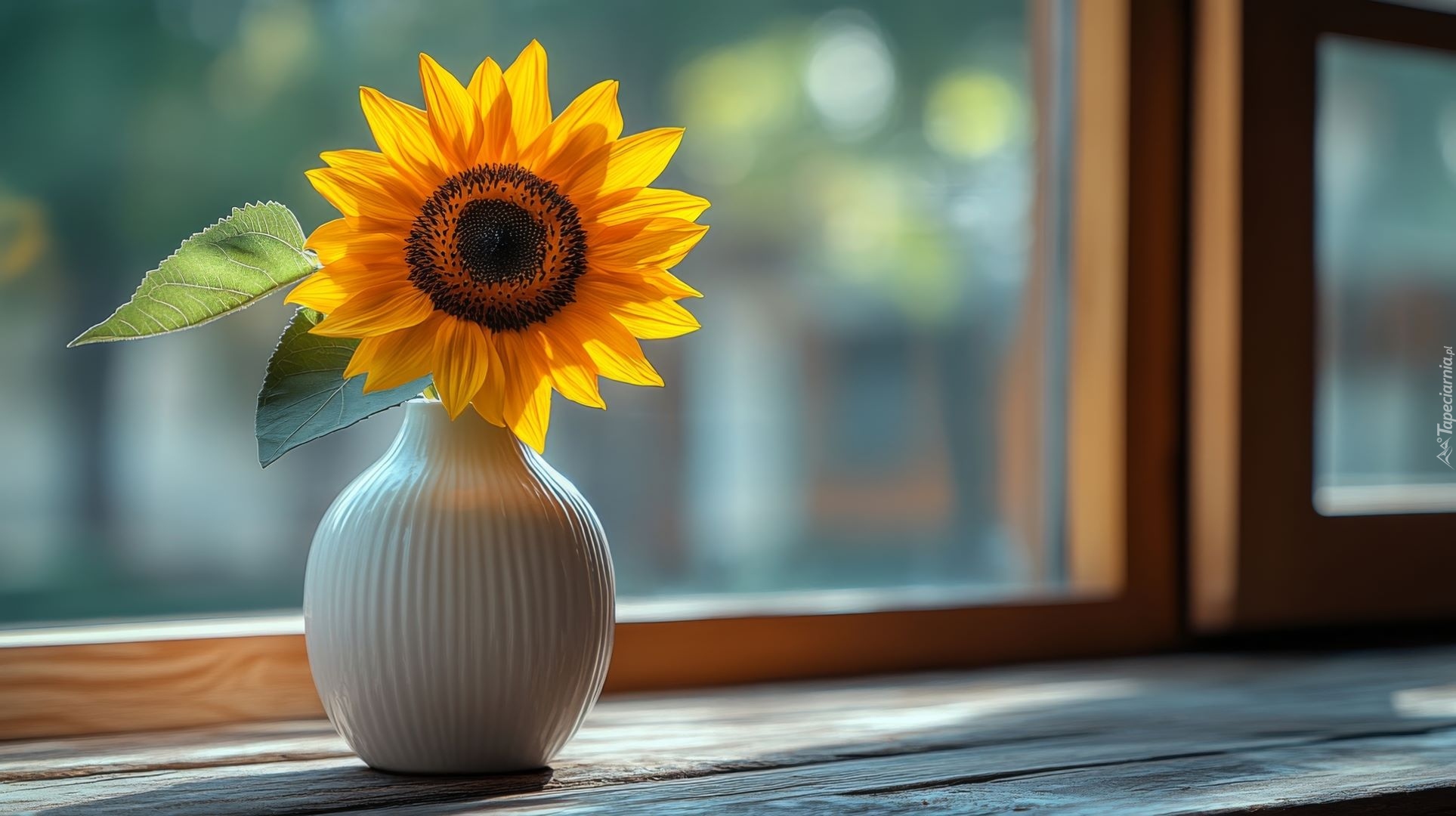 Edytor tapety: Słonecznik w białym wazonie na parapecie okna