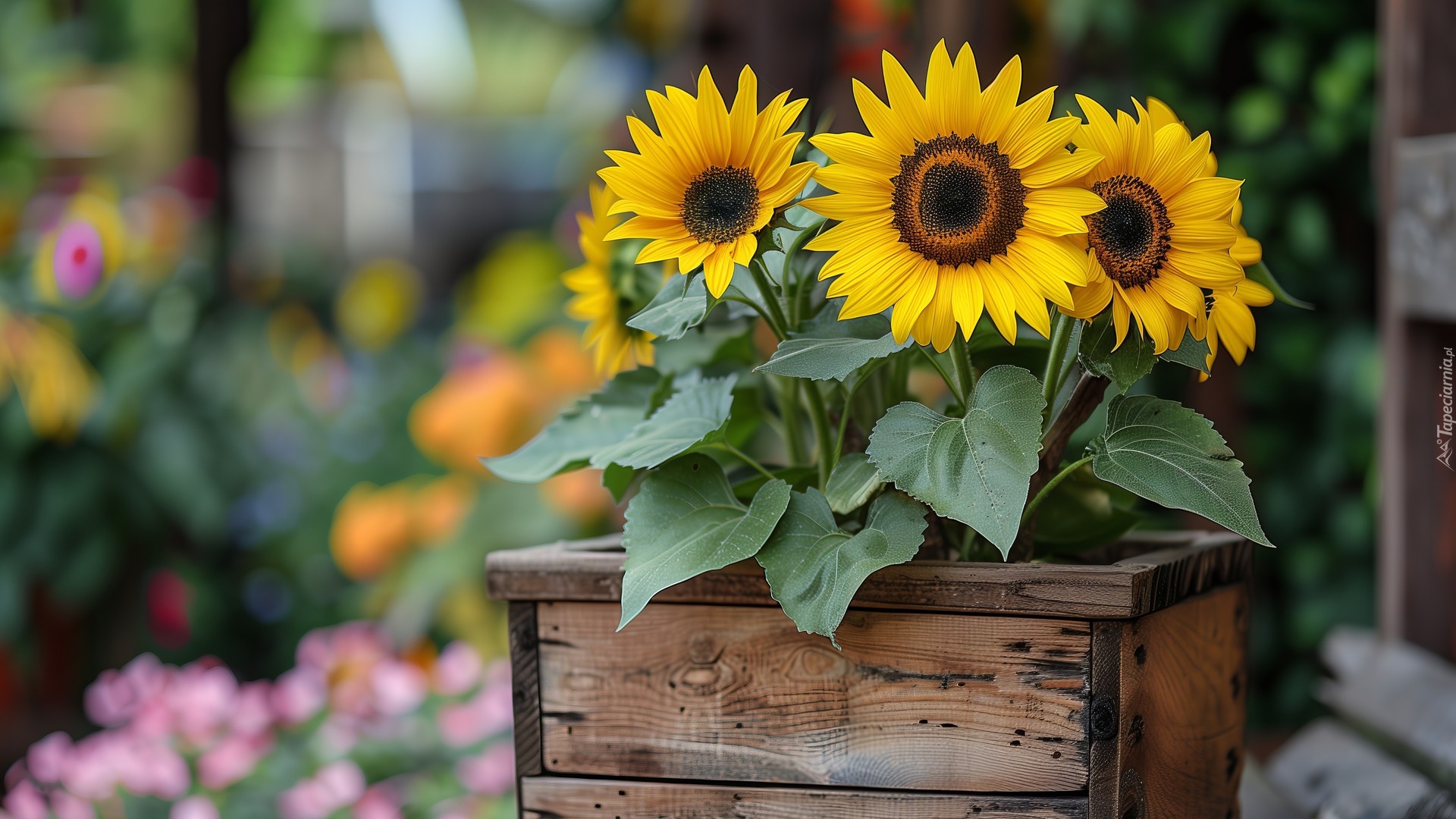 Edytor tapety: Żółte słoneczniki w drewnianej skrzynce