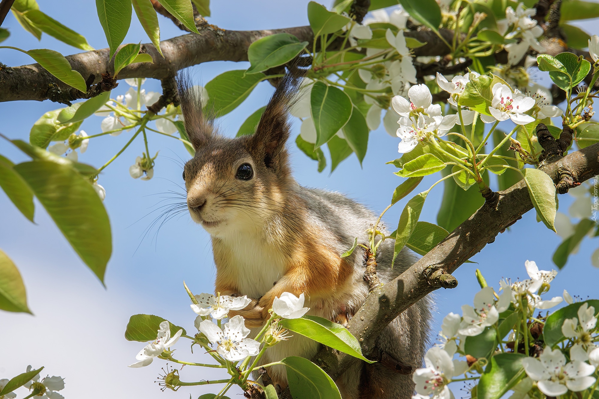 Edytor tapety: Szara wiewiórka na gałęzi kwitnącego drzewa owocowego