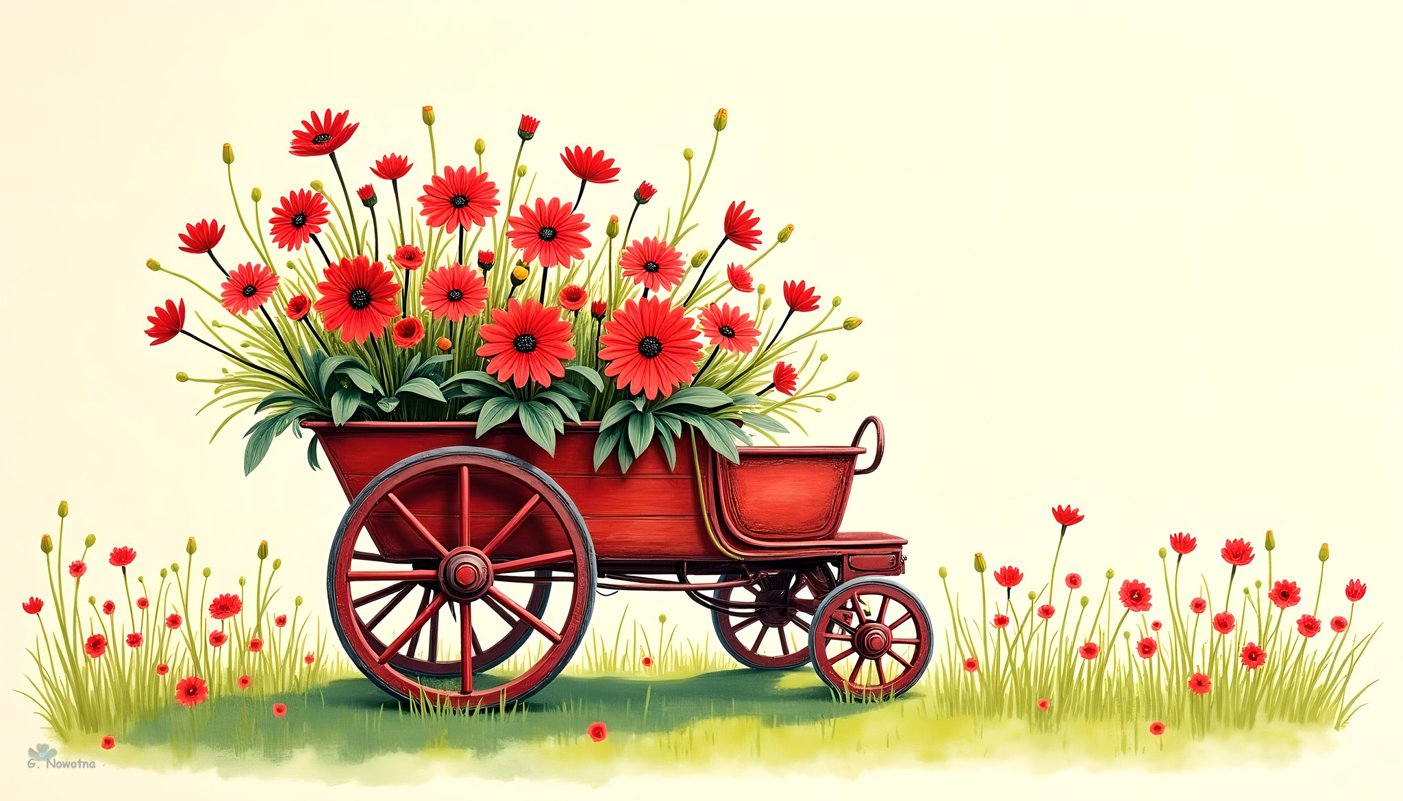 Edytor tapety: Czerwone kwiaty w wózku i obok w 2D