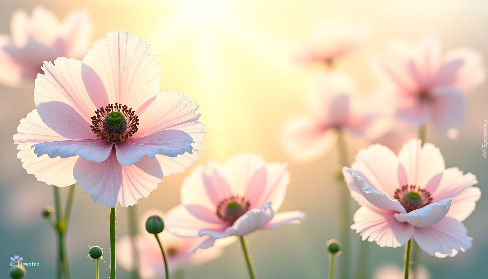 Edytor tapety: Rozświetlone jasnoróżowe kwiaty na rozmytym tle