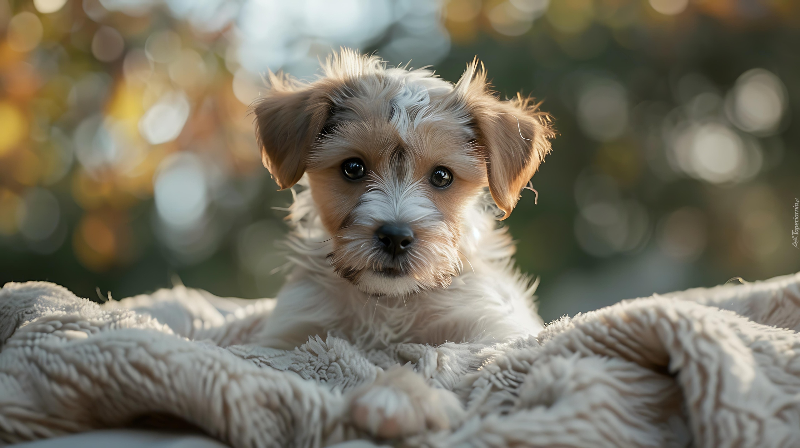 Edytor tapety: Spojrzenie szczeniaka leżącego na posłaniu