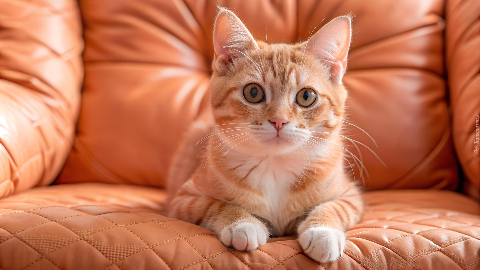 Edytor tapety: Mały rudy kotek leżący na skórzanym fotelu
