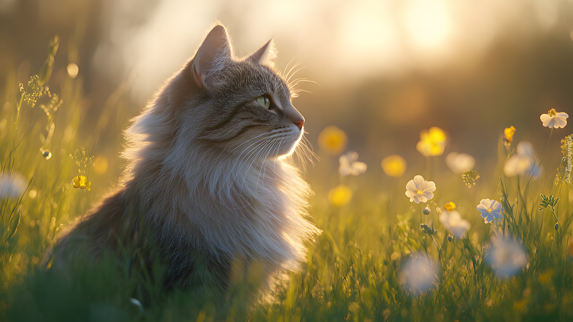 Edytor tapety: Puszysty kot siedzący wśród kwiatów na słonecznej łące