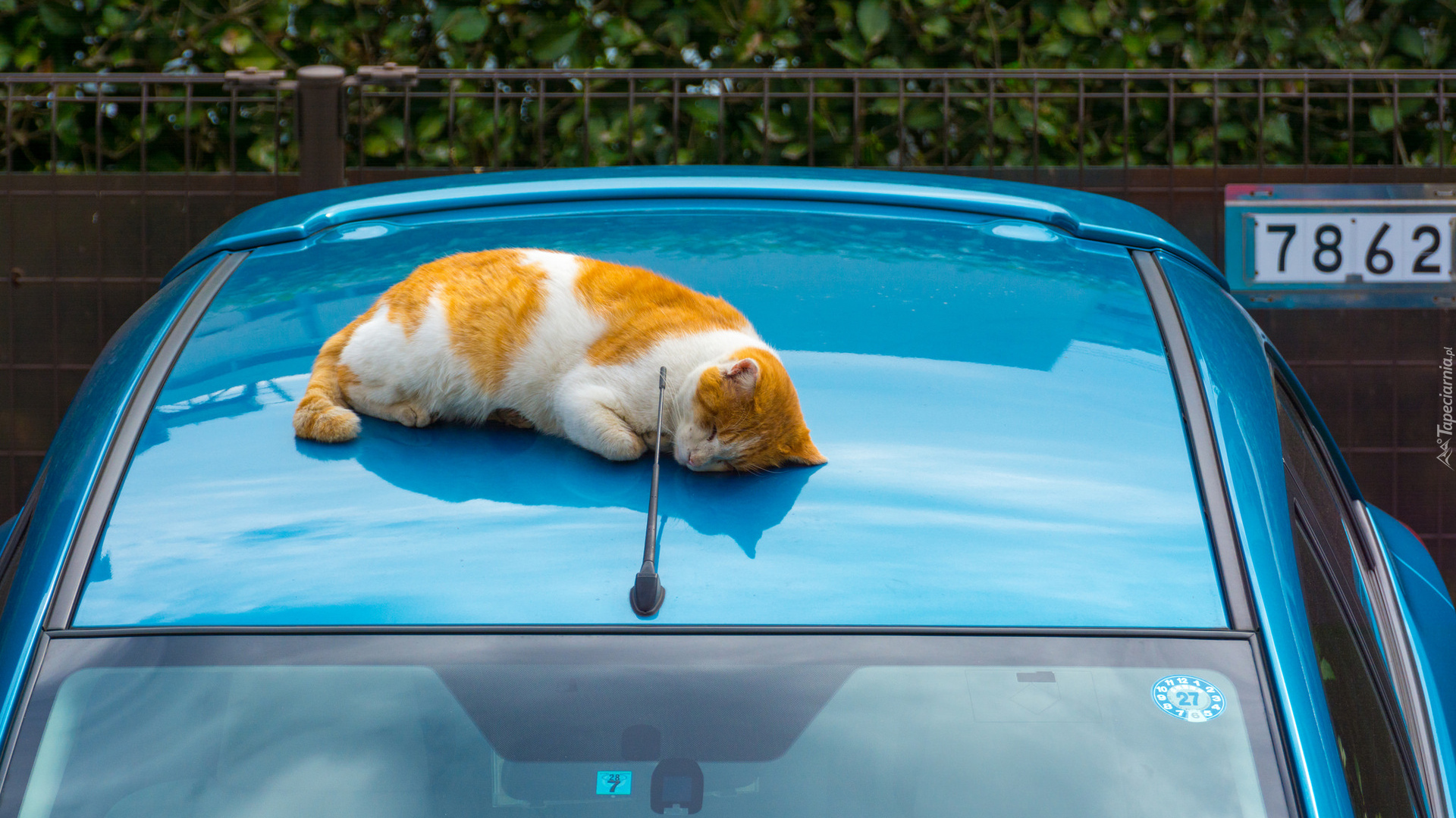 Edytor tapety: Śpiący biało-rudy kot na dachu samochodu