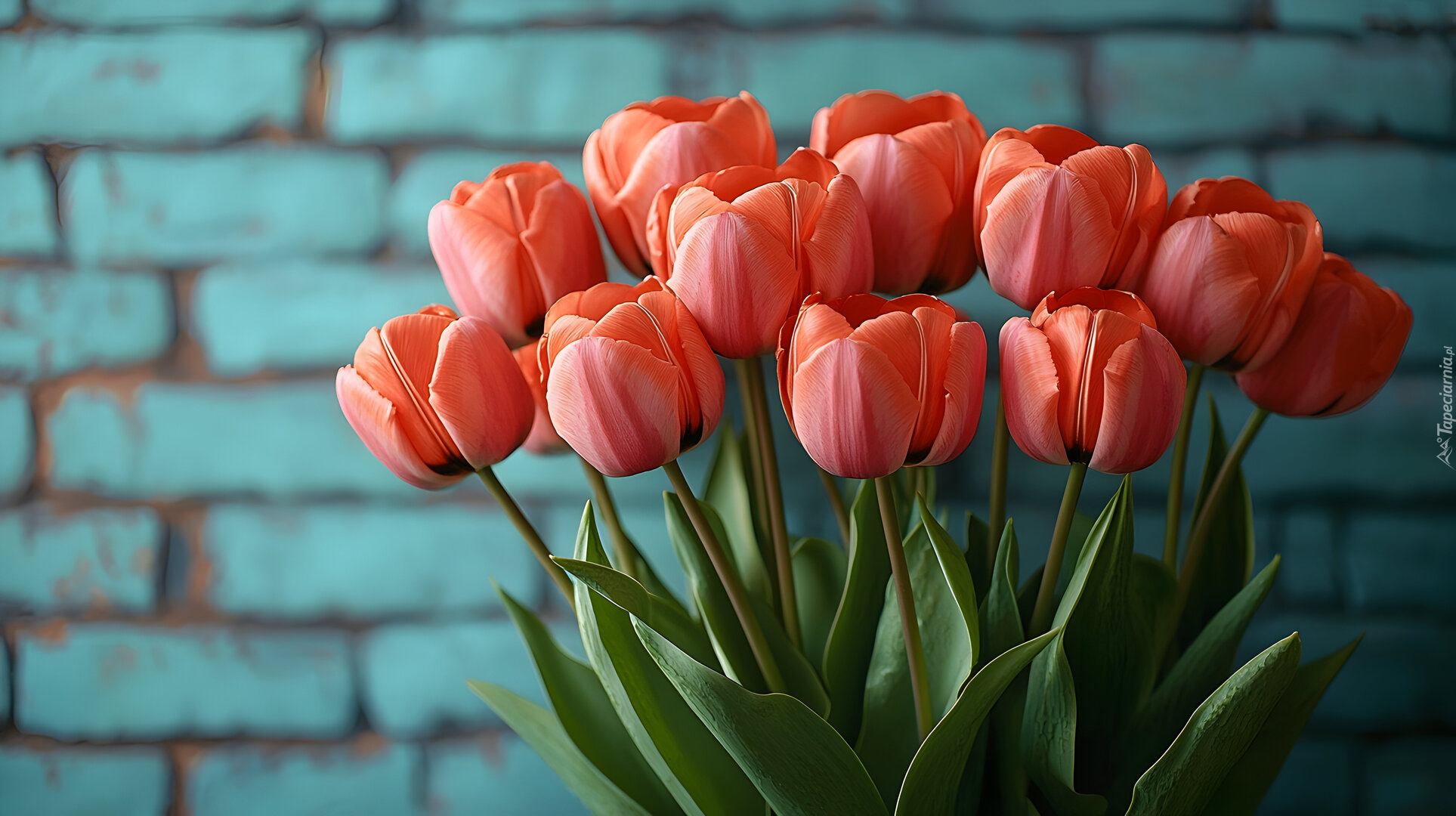 Edytor tapety: Czerwone tulipany na tle muru z cegieł
