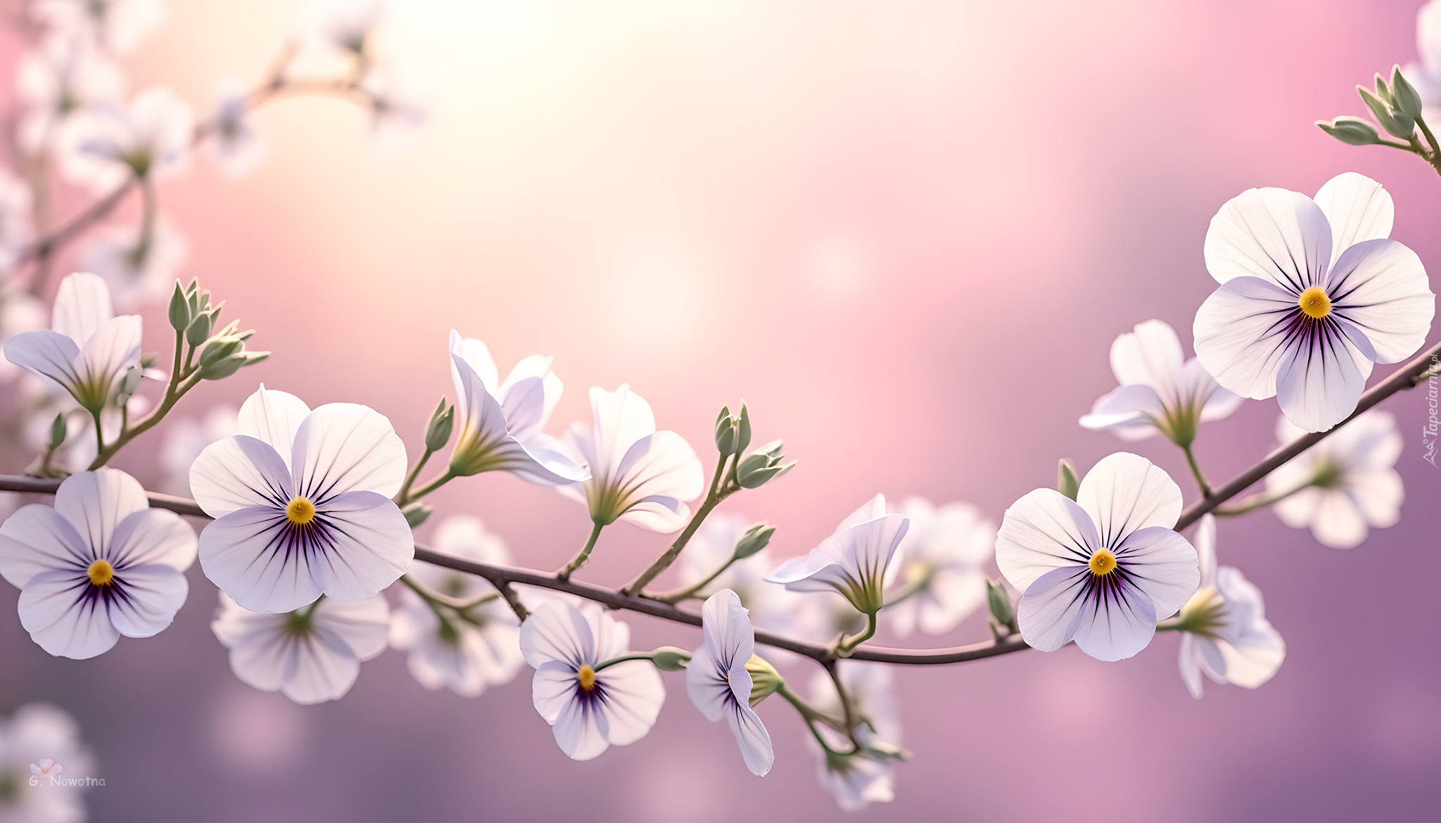 Edytor tapety: Rozświetlone białe kwiaty na gałązce w grafice