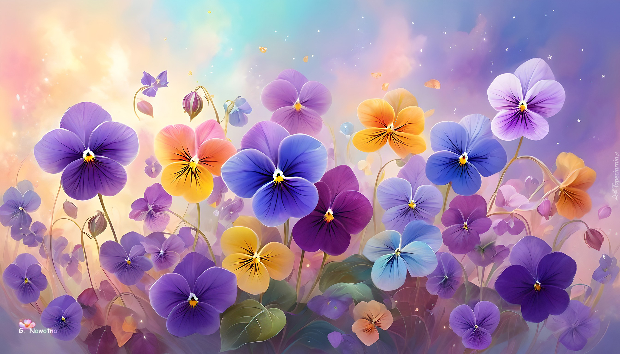 Edytor tapety: Grafika z kolorowymi bratkami na kolorowym tle