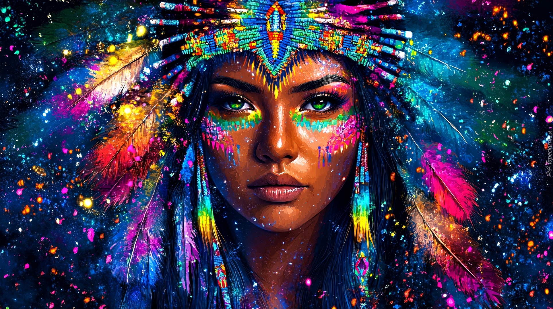 Edytor tapety: Zielonooka Indianka w kolorowym pióropuszu