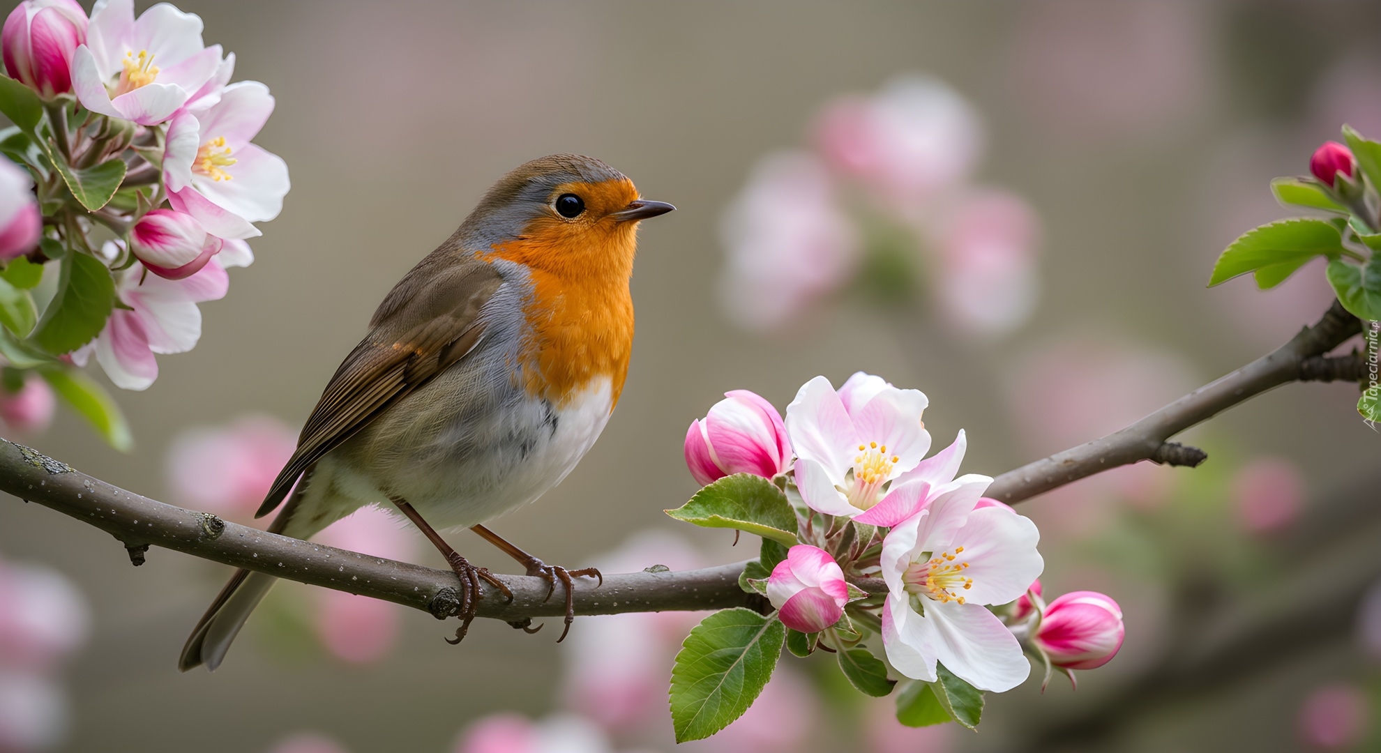 Edytor tapety: Rudzik na gałązce z kwiatami drzewa owocowego