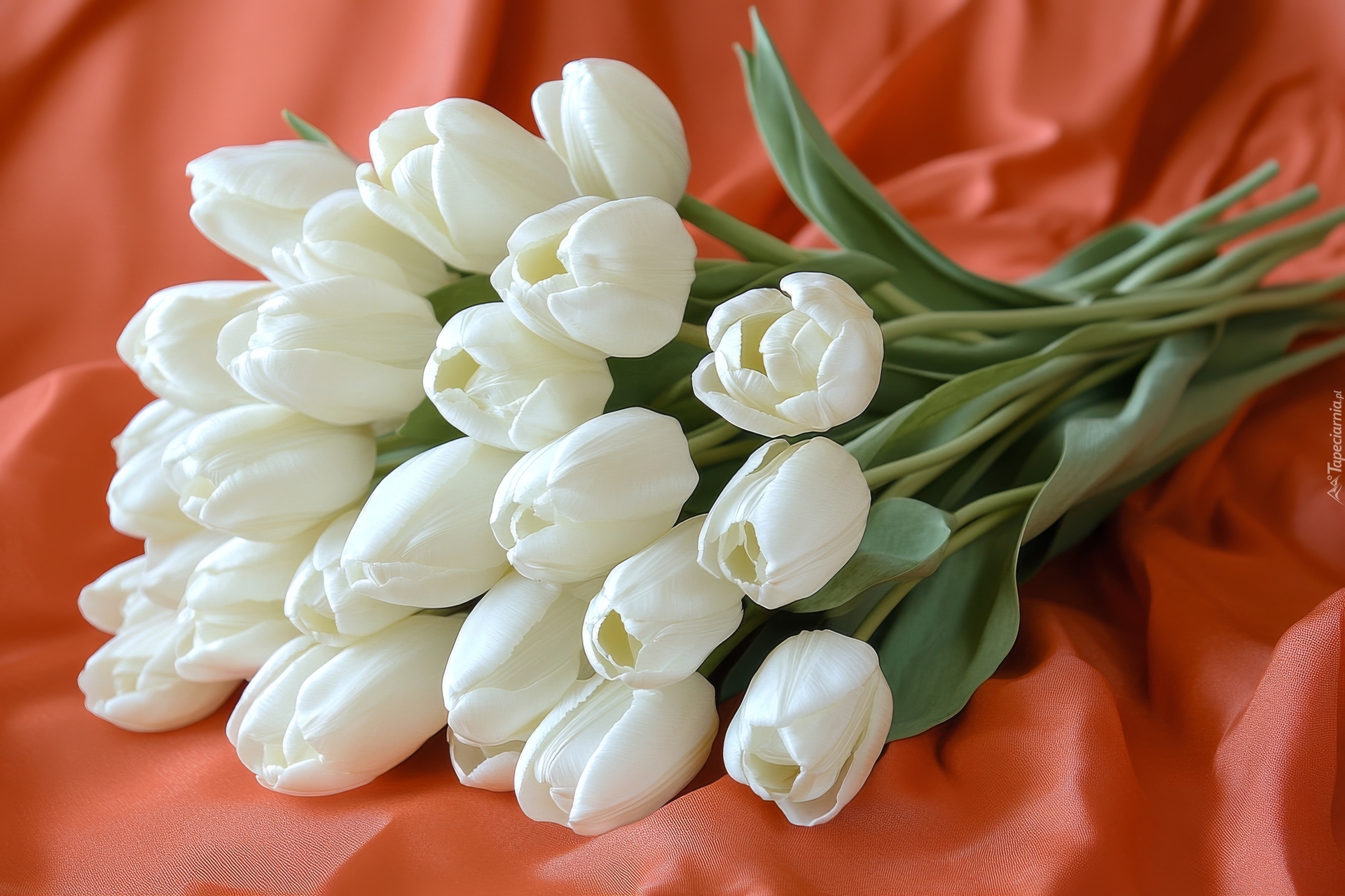 Edytor tapety: Bukiet białych tulipanów na pomarańczowym materiale