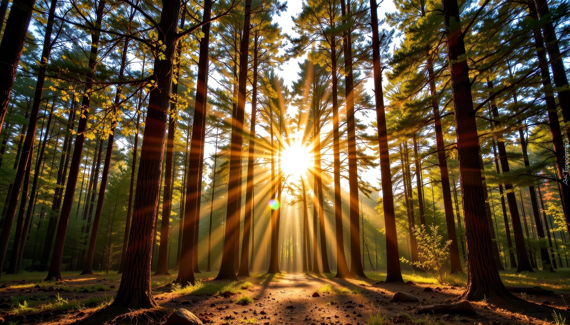 Edytor tapety: Przebijające promienie słońca wśród drzew w lesie