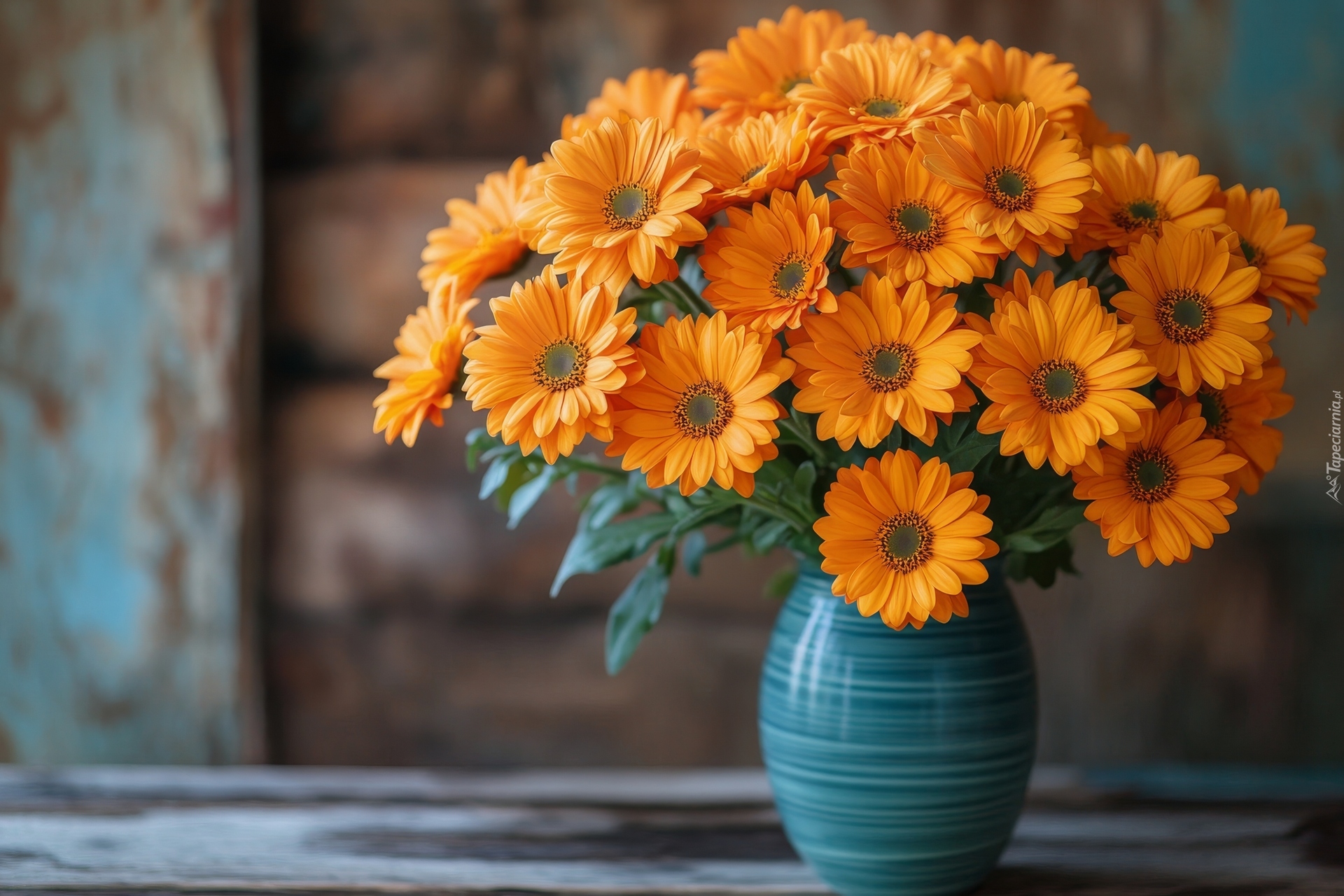 Edytor tapety: Pomarańczowe kwiaty w niebieskim wazonie