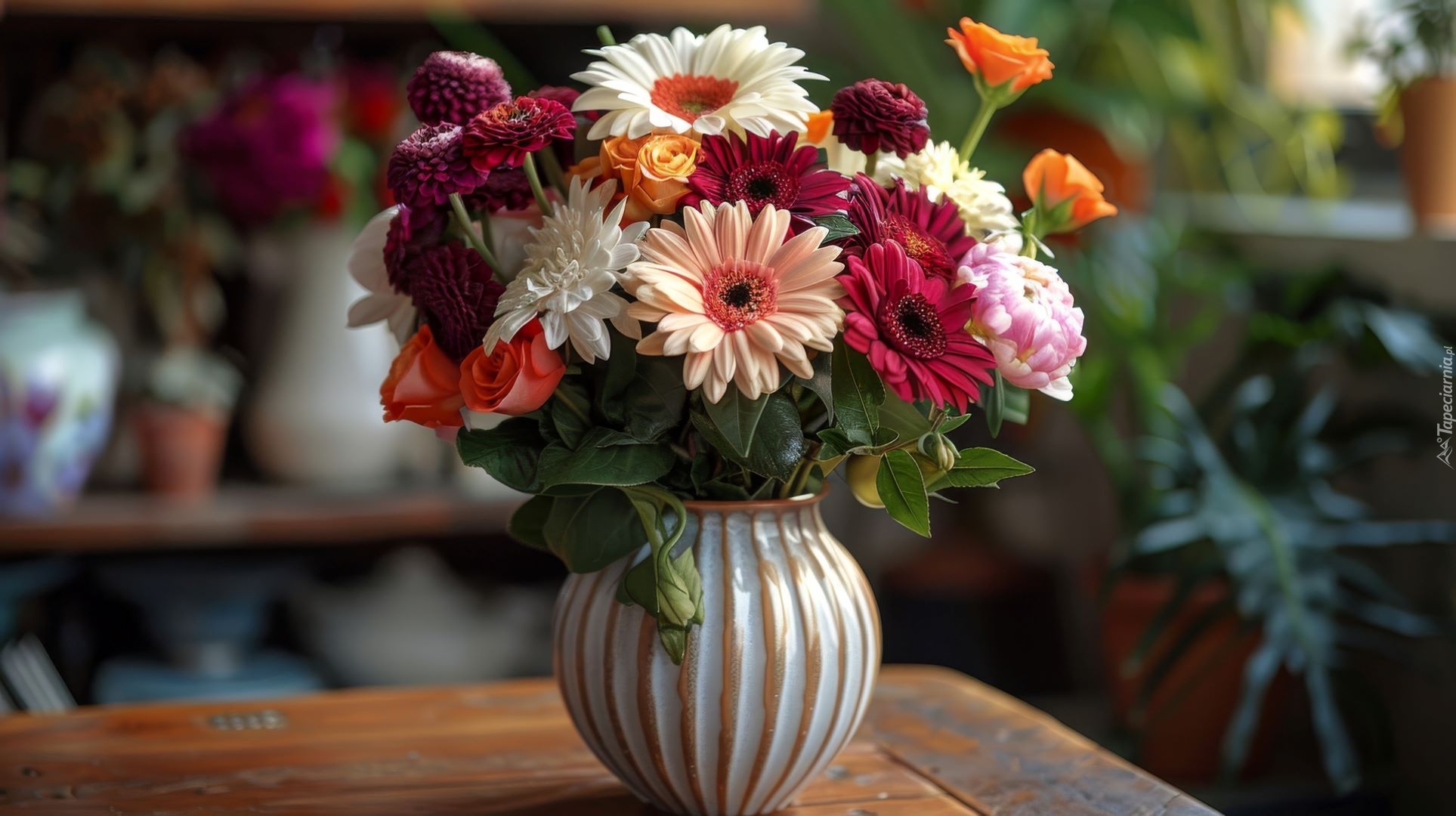 Edytor tapety: Bukiet kolorowych kwiatów w wazonie na stole