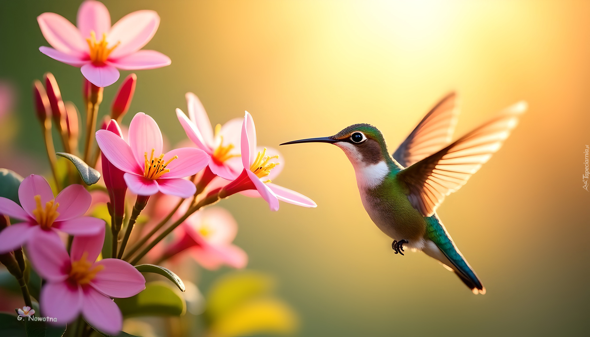 Edytor tapety: Koliber i różowe kwiaty w grafice