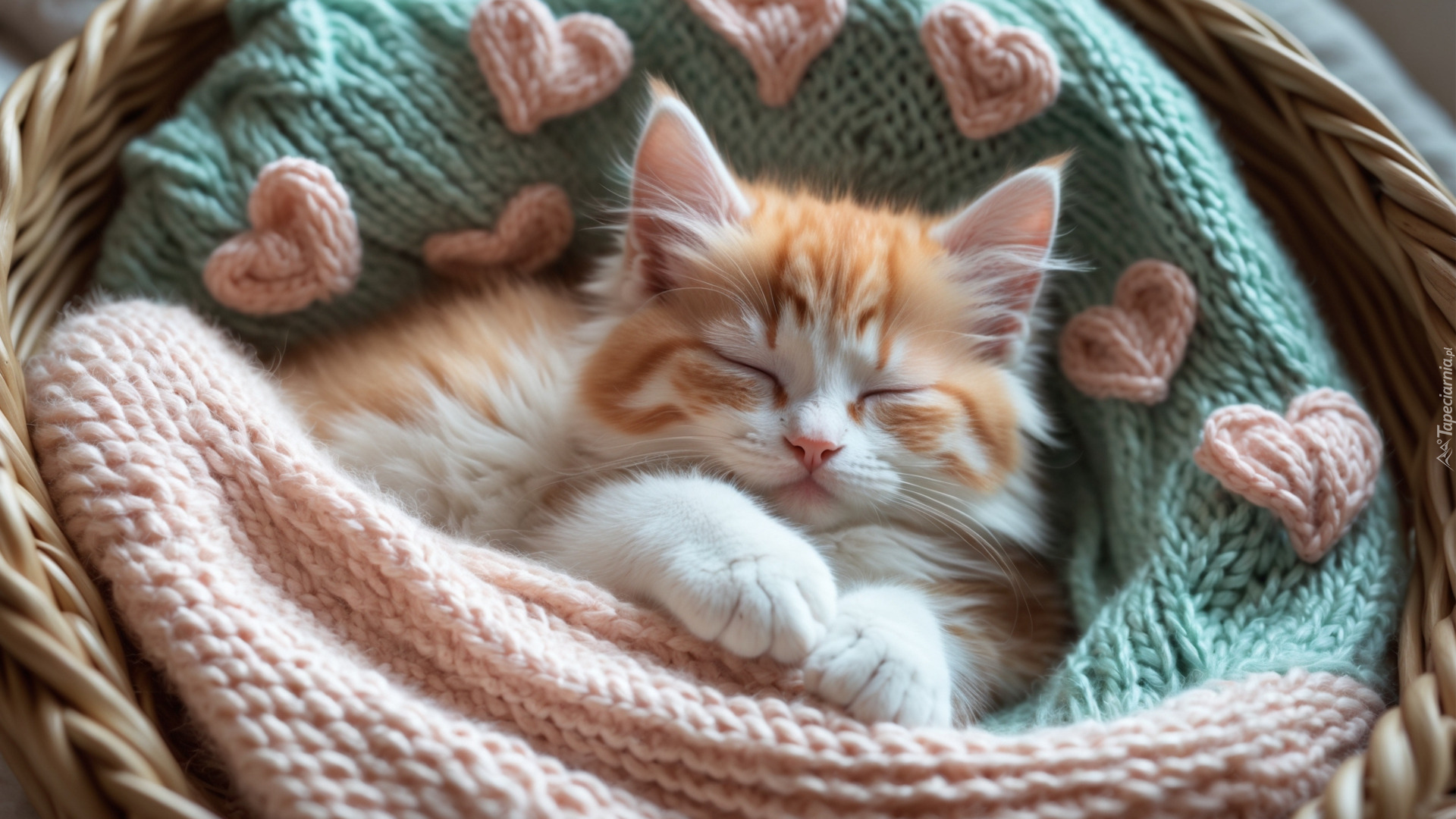 Edytor tapety: Mały kotek śpiący na kocyku w koszyku