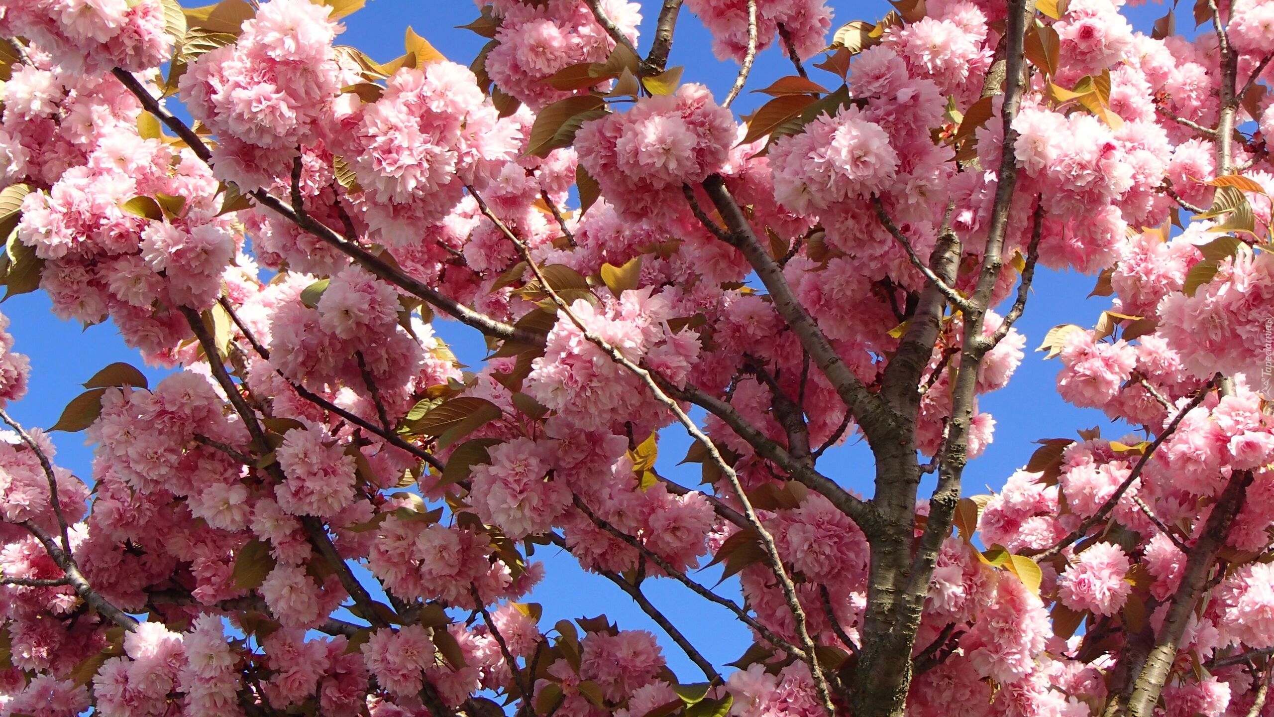 Edytor tapety: Różowe kwiaty wiśni piłkowanej na gałęziach