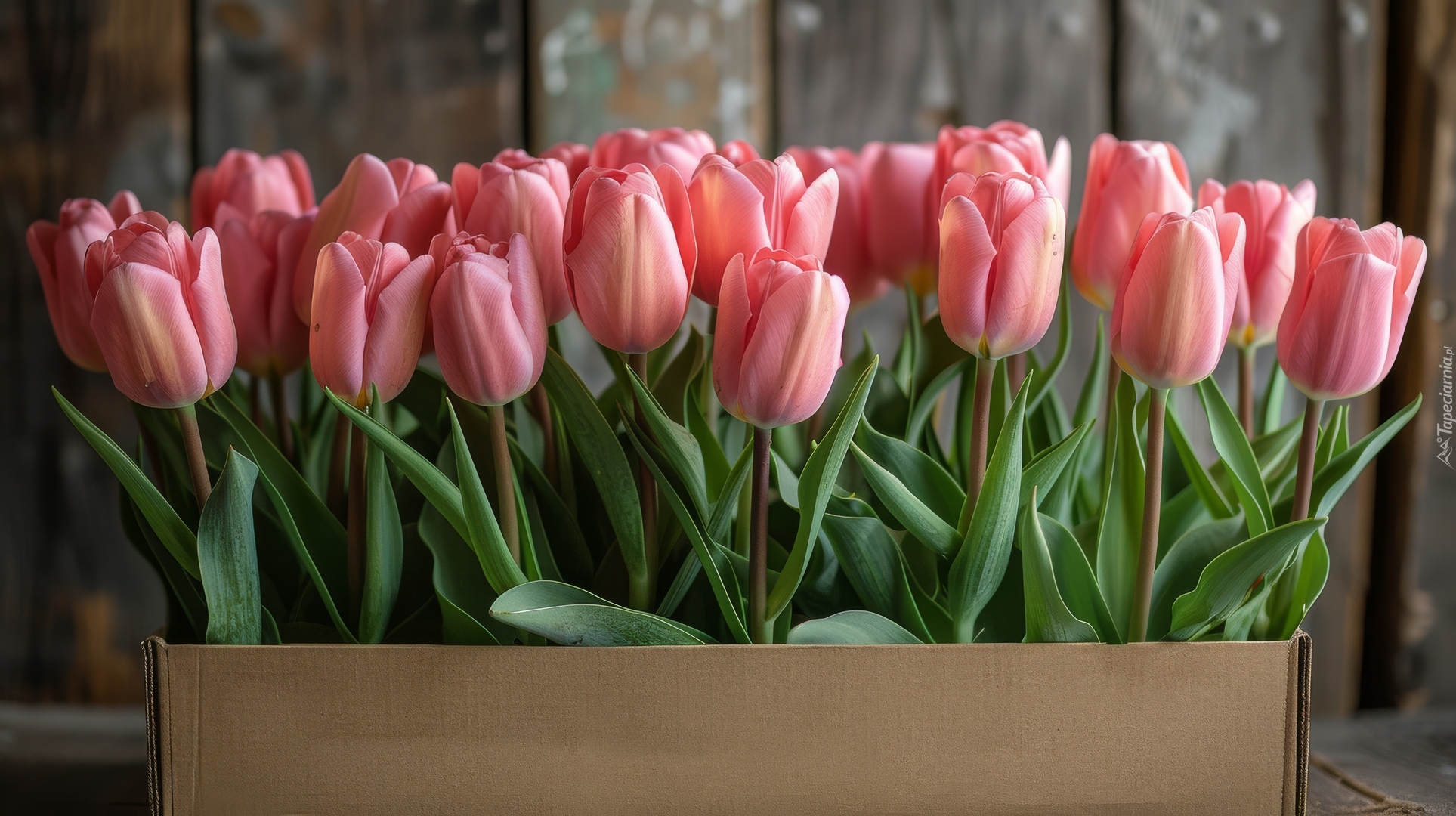 Edytor tapety: Rozkwitające różowe tulipany w tekturowym pudełku