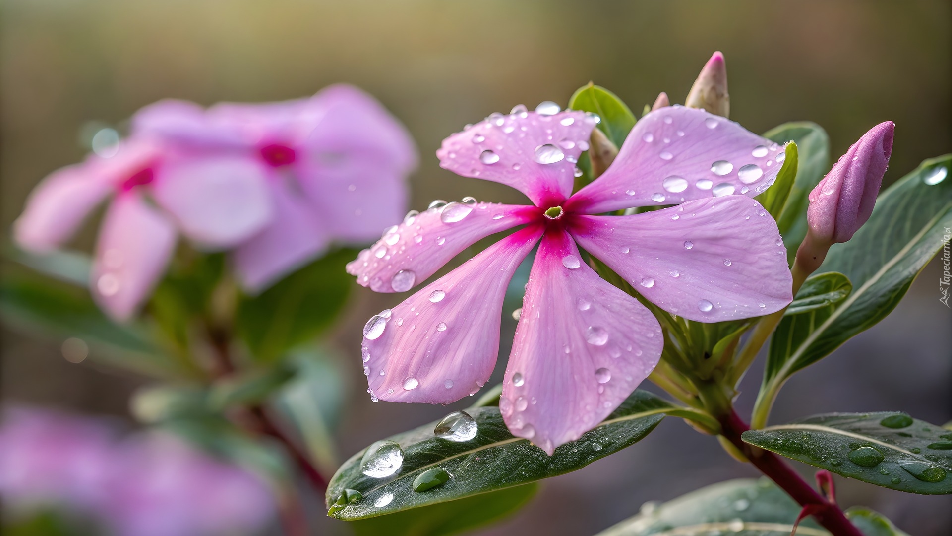 Edytor tapety: Krople wody na różowym kwiatku i liściach