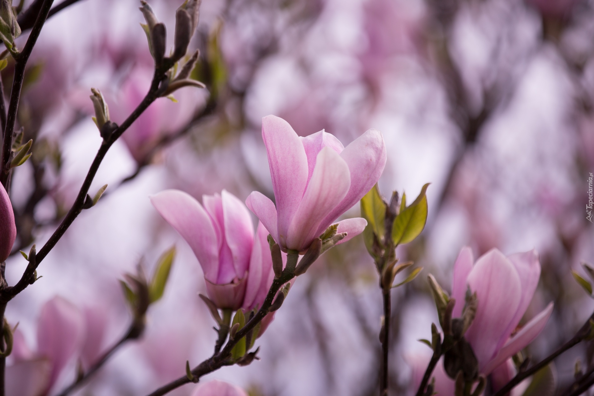 Edytor tapety: Jasnoróżowe kwiaty magnolii na rozmytym tle