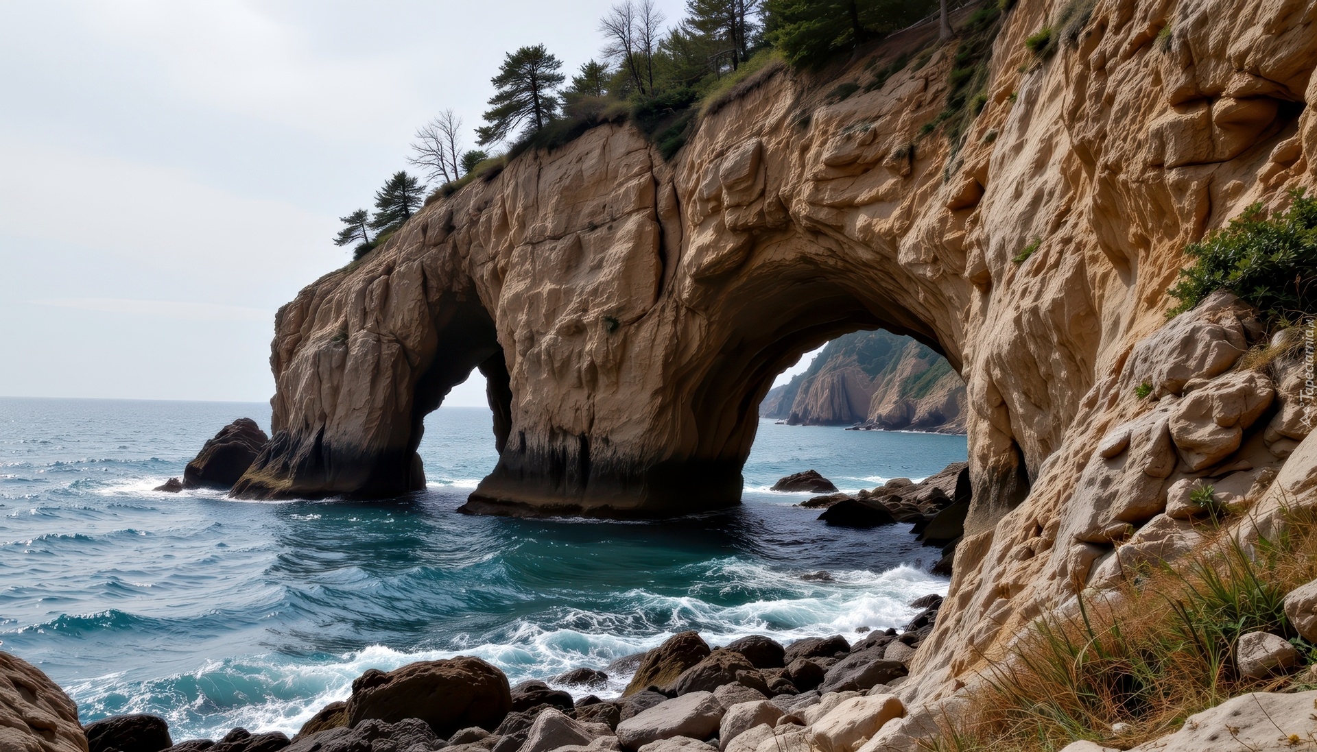 Edytor tapety: Drzewa na łukach skalnych w morzu