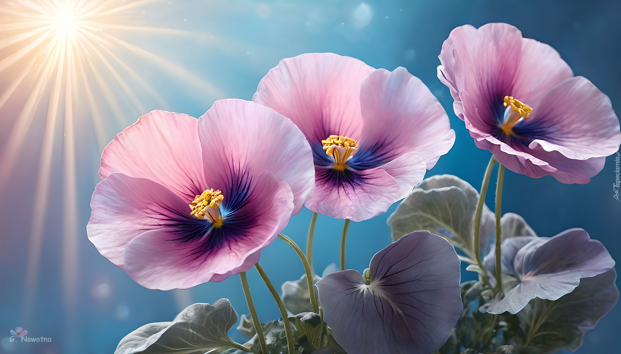 Edytor tapety: Trzy różowe kwiaty z liśćmi w promieniach słońca