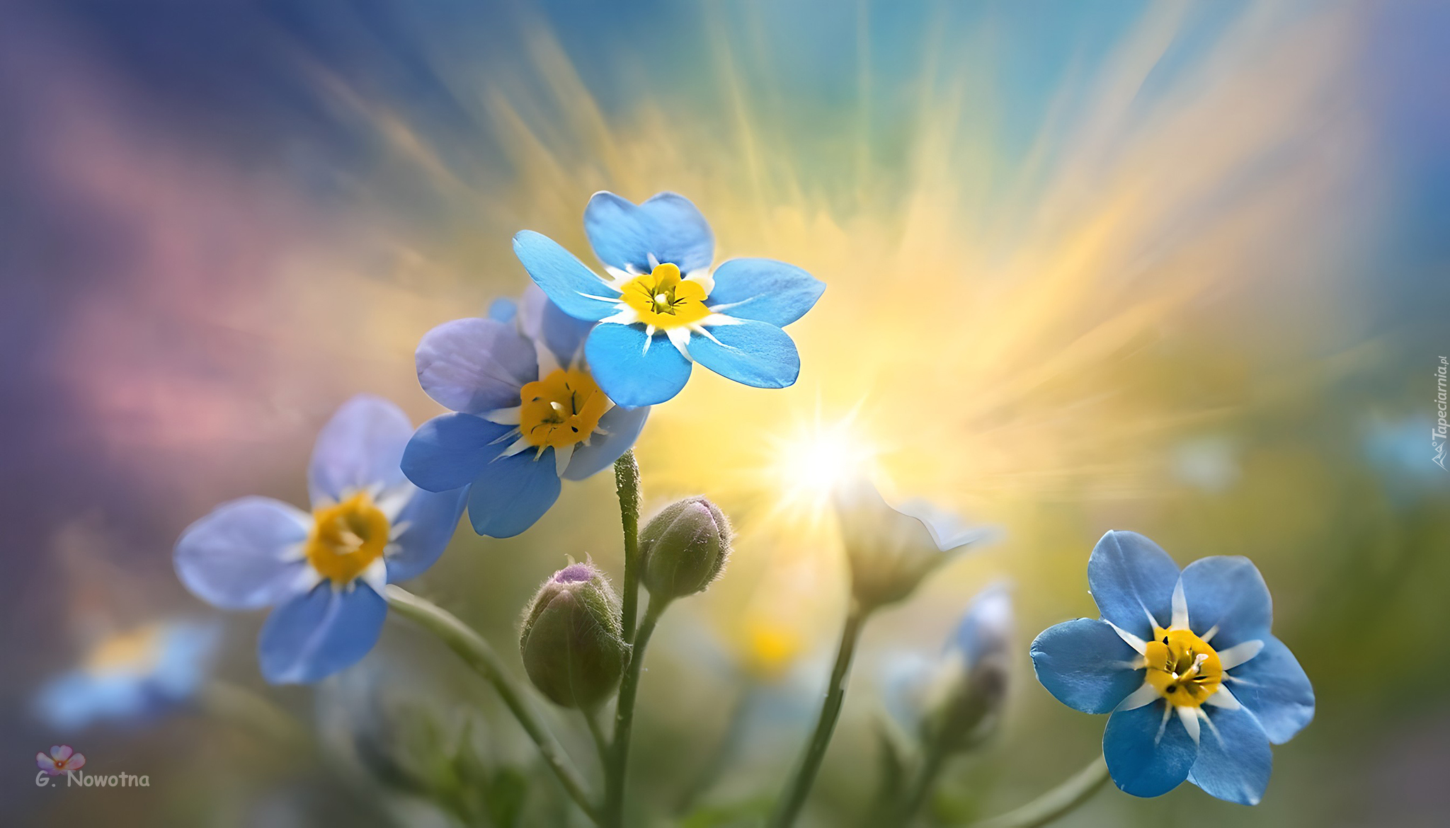 Edytor tapety: Niebieskie niezapominajki i pąki na tle słonecznego blasku