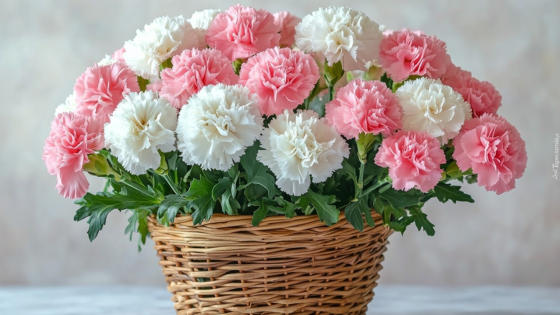Edytor tapety: Białe i różowe goździki w wiklinowym koszyku