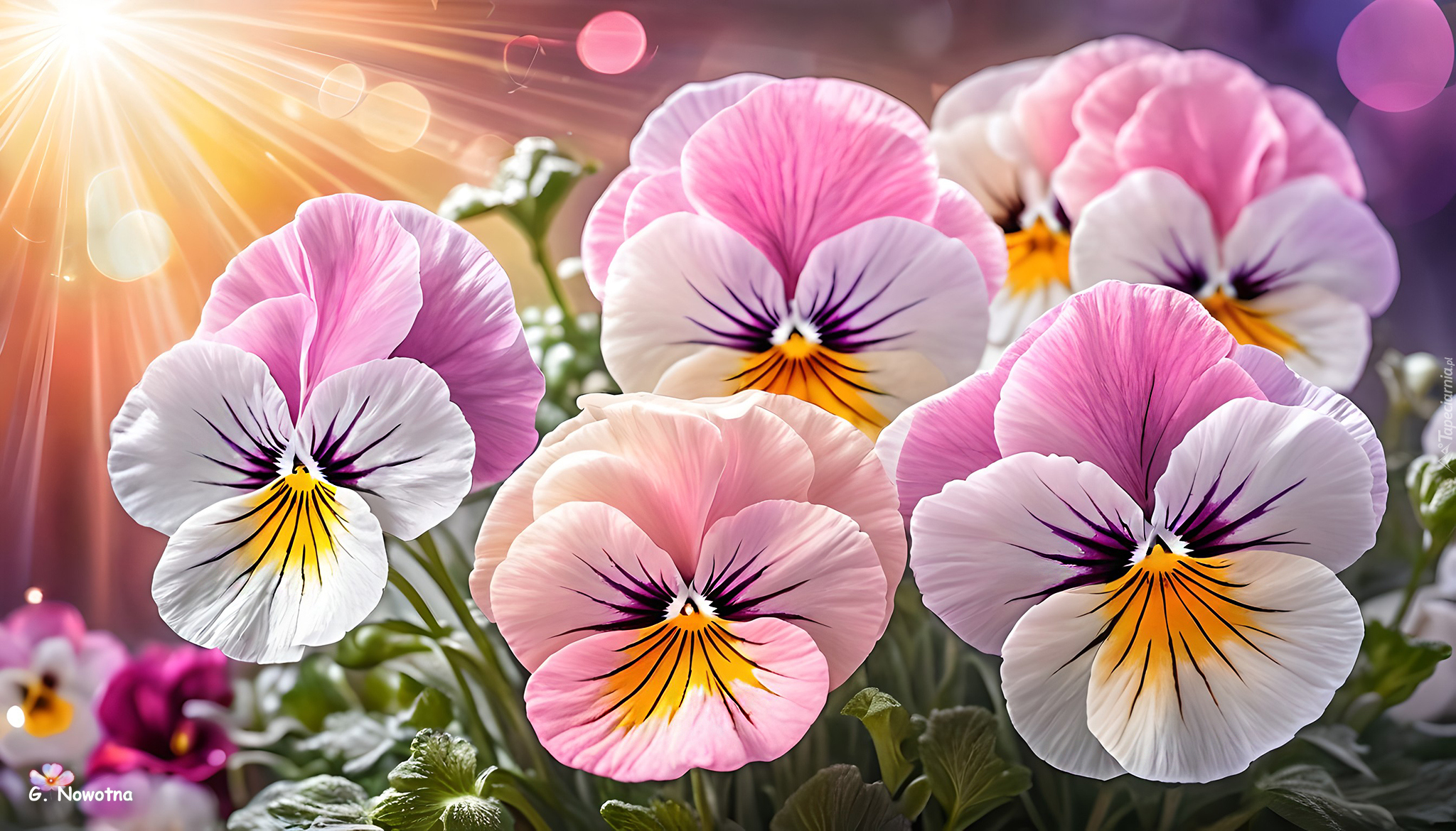 Edytor tapety: Kolorowe bratki w słonecznych promieniach