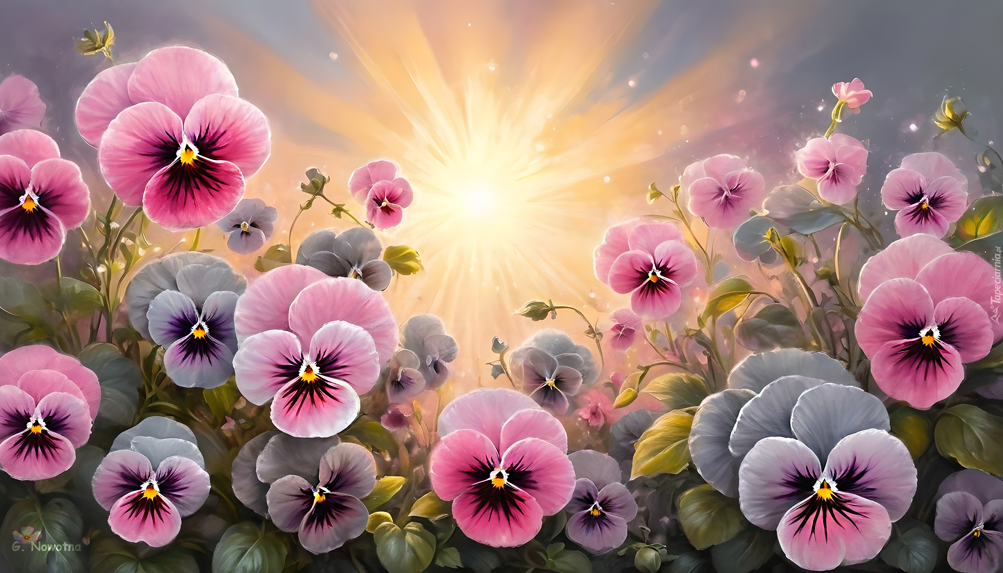 Edytor tapety: Różowe i szare bratki na tle słonecznych promieni