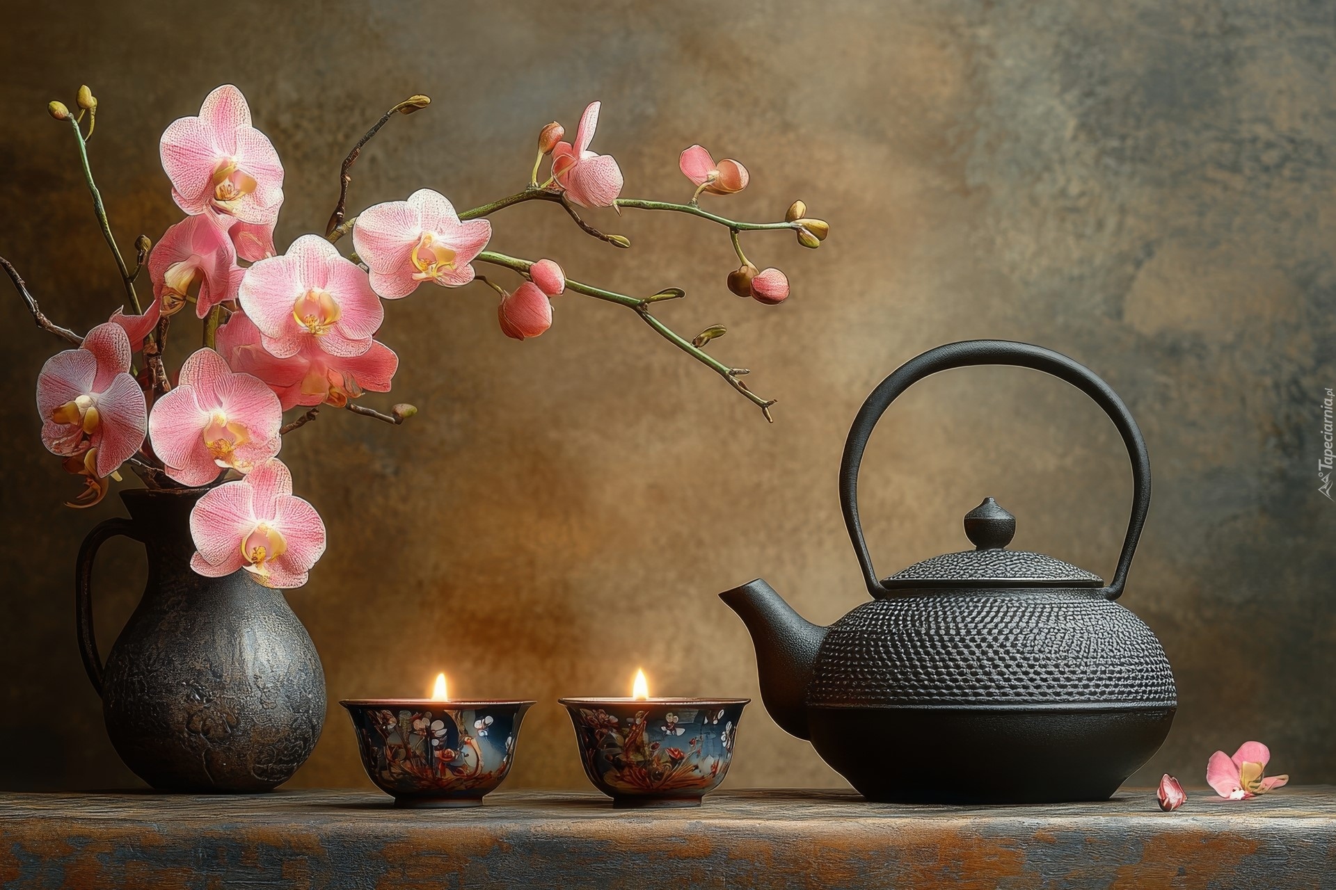 Edytor tapety: Różowe storczyki w dzbanku obok świec i czajnika