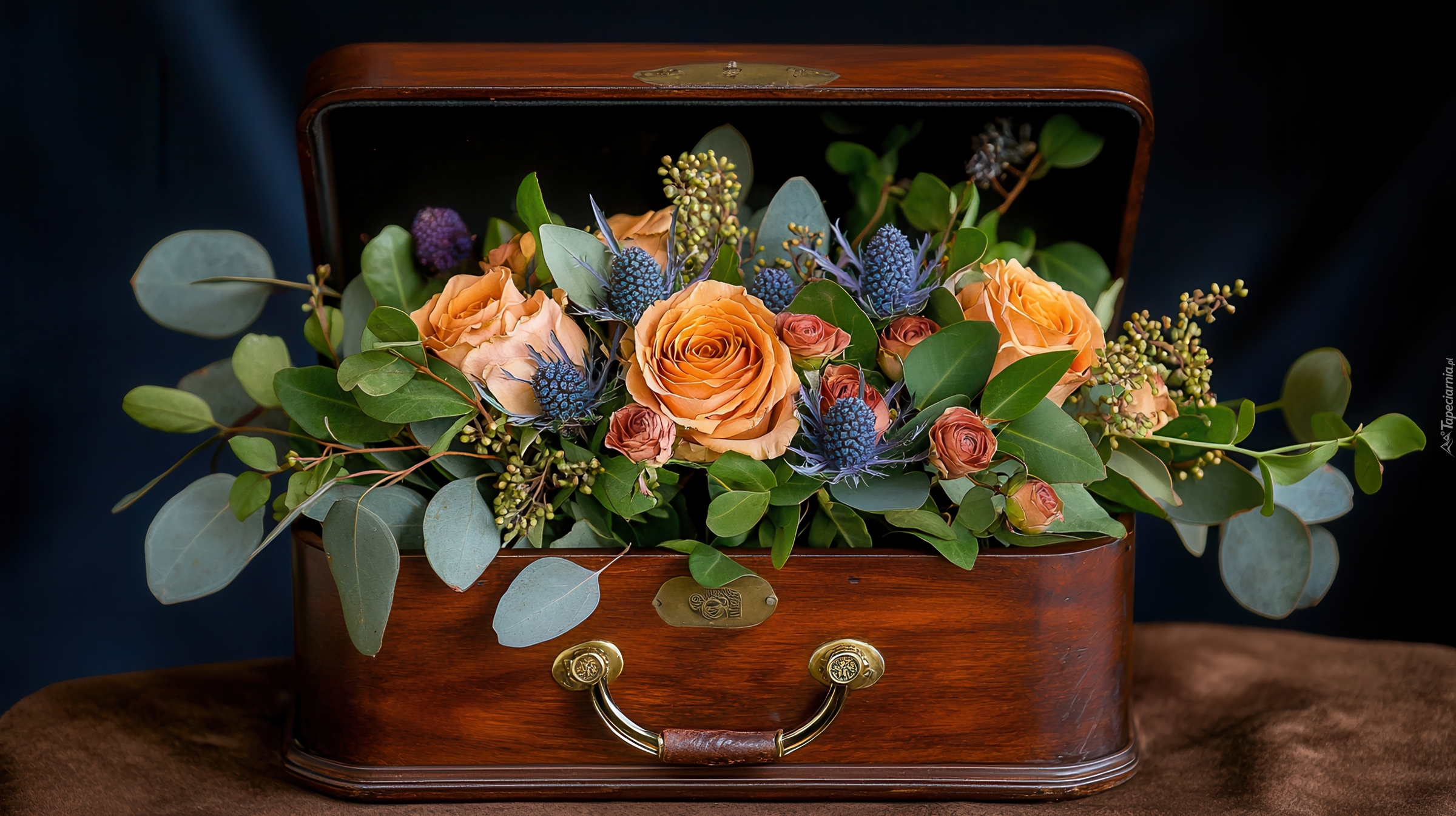 Edytor tapety: Róże i gałązki z liśćmi w skrzynce