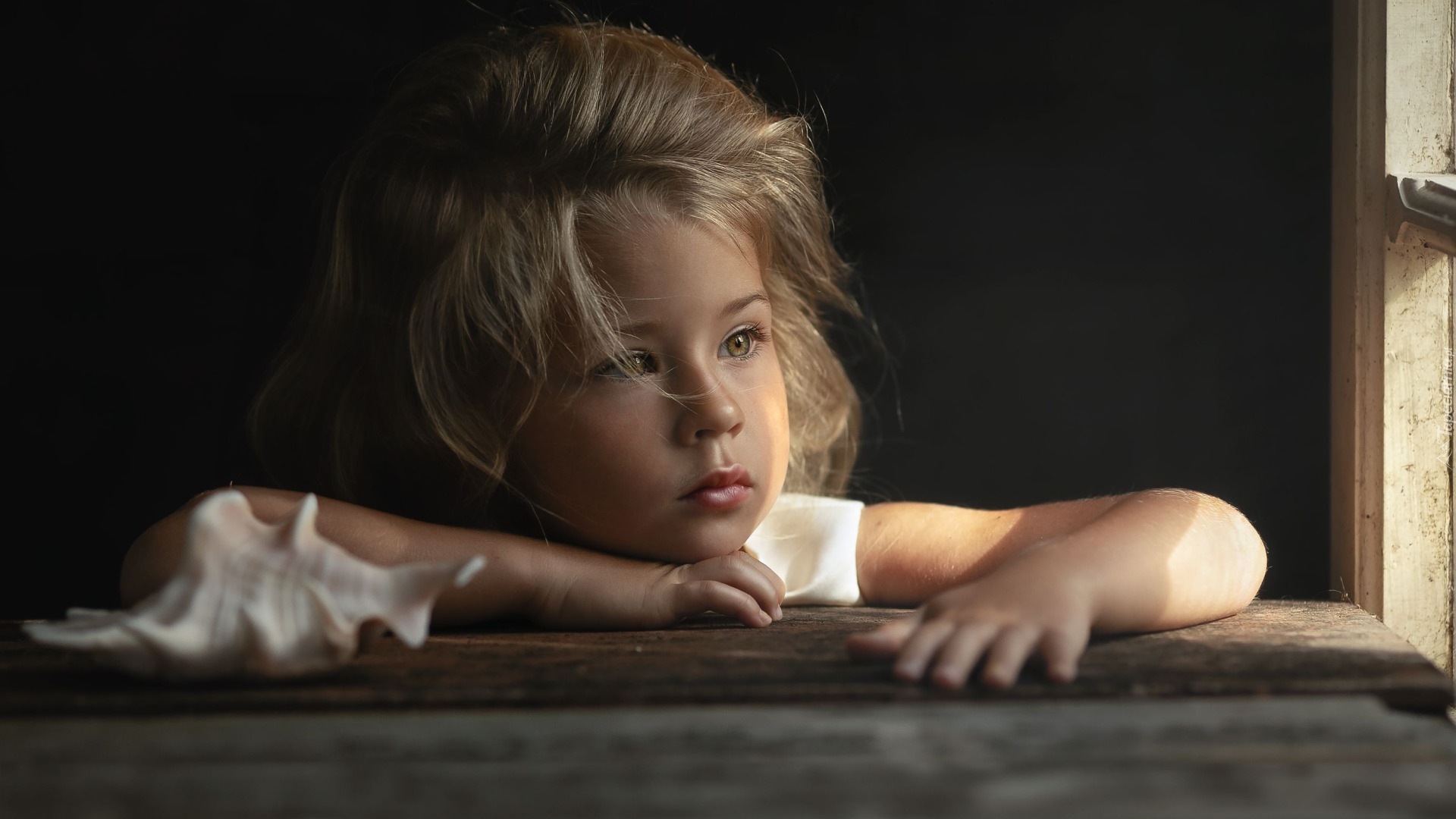 Edytor tapety: Zamyślona dziewczynka z rękami na parapecie okna