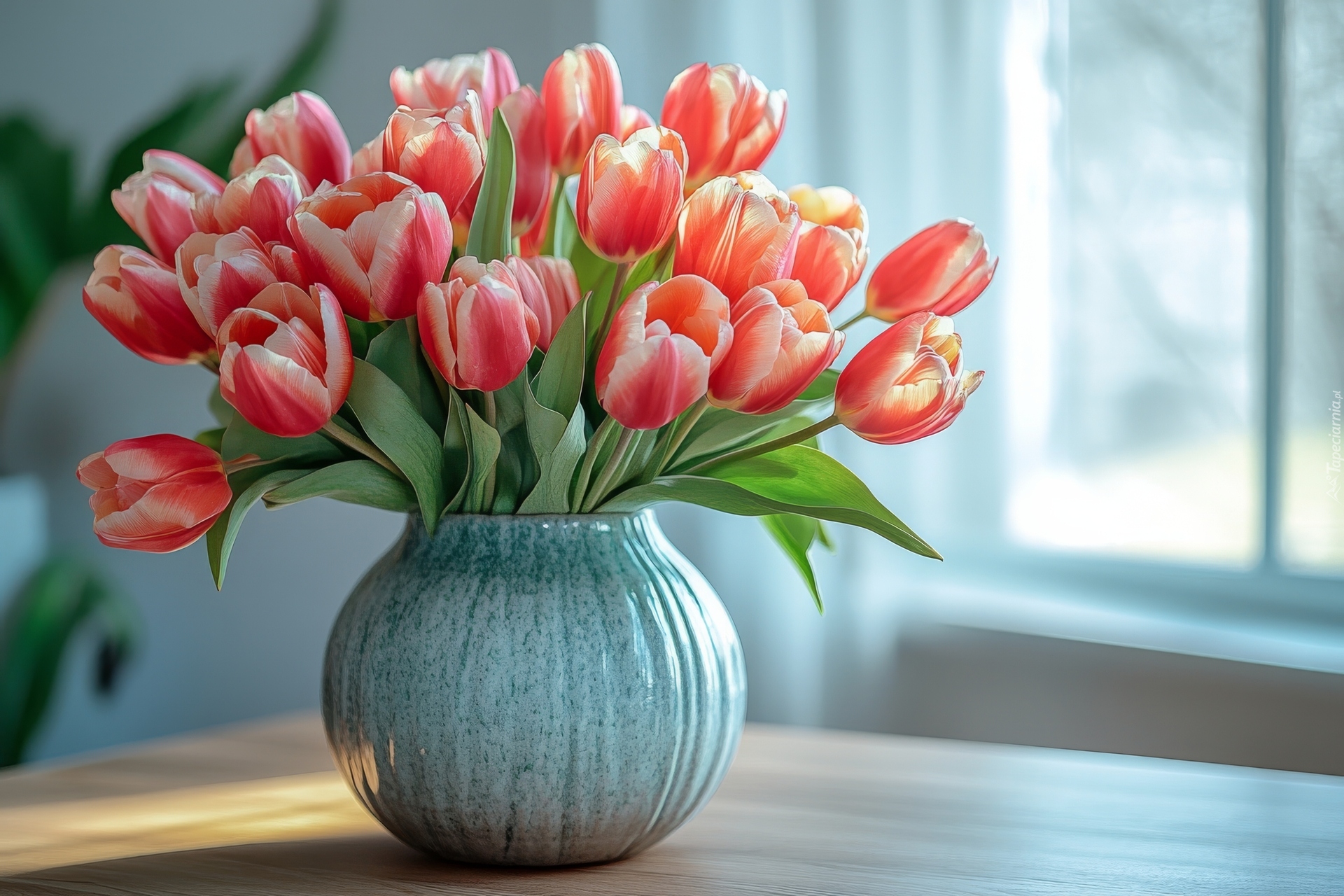 Edytor tapety: Czerwono-białe tulipany w wazonie przy oknie