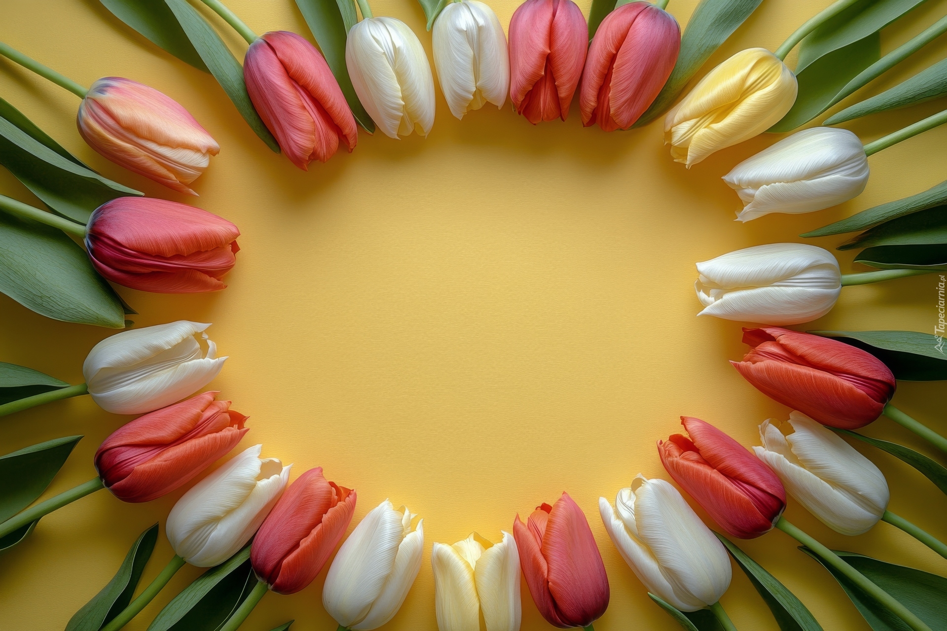 Edytor tapety: Kolorowe tulipany ułożone na żółtym tle